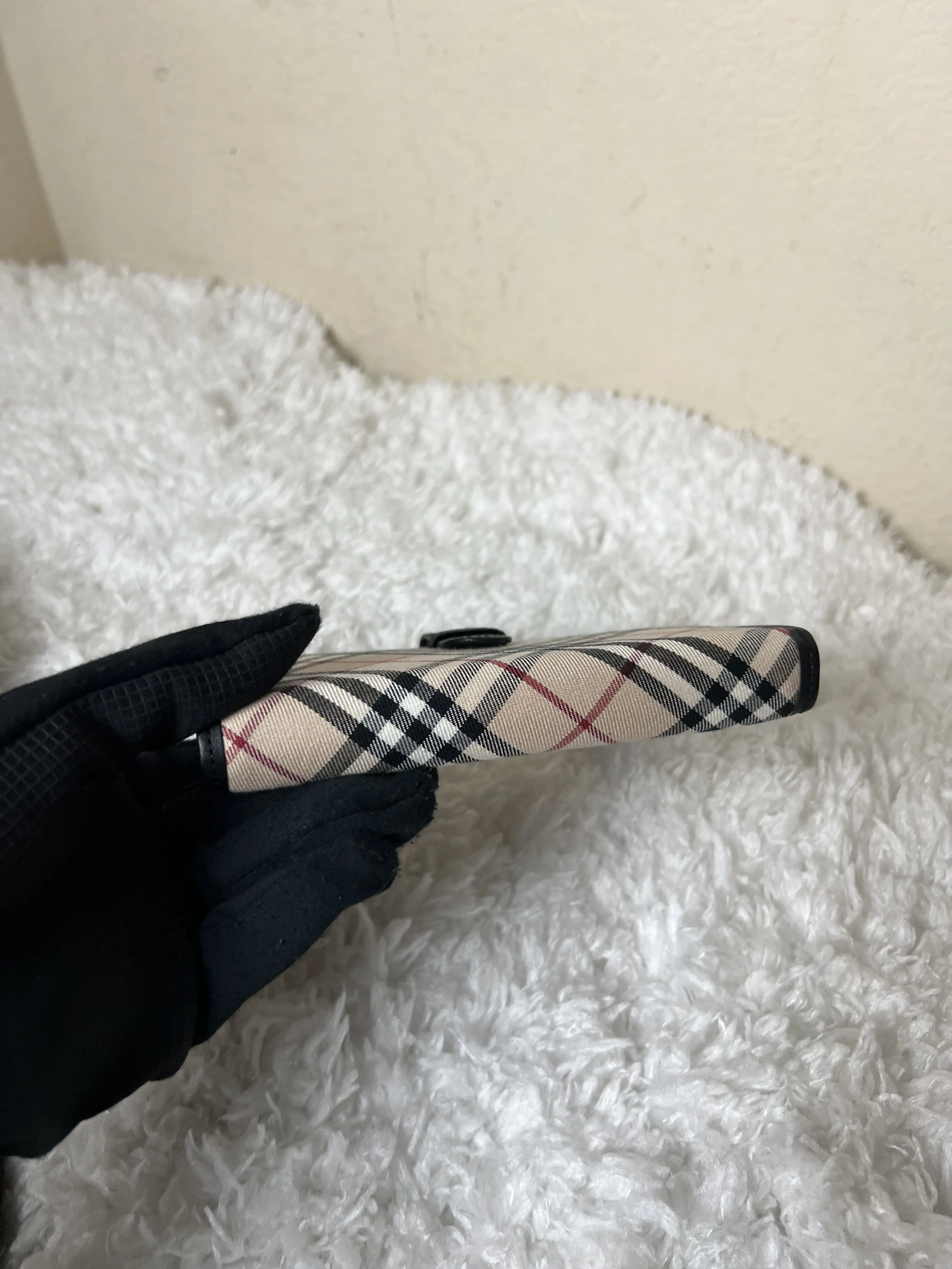 Tan and multicolored canvas Burberry agenda book with dual interior pockets, leather-trimming, snap closure at front, silver-toned hardware and brand stamp at interior. Complete inclusion.