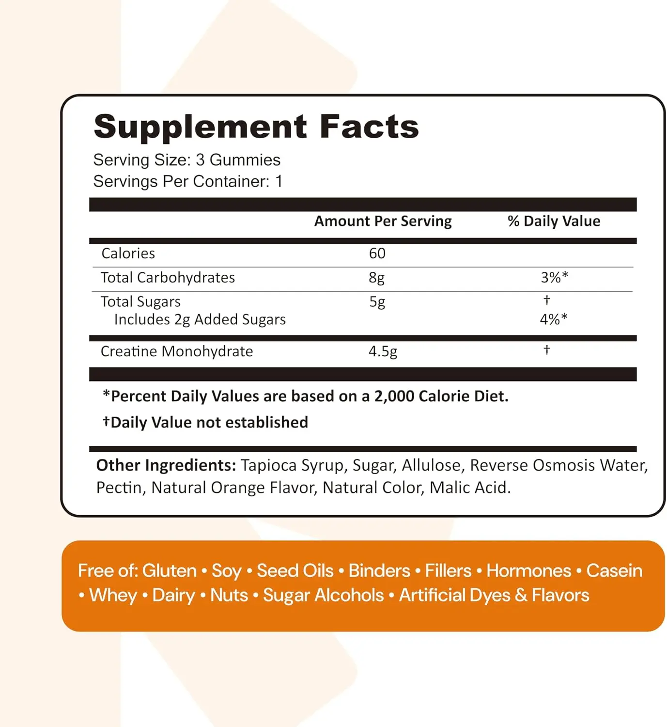 Tapioca Syrup,Sugar,Allulose,Reverse Osmosis Water,Pectin,Natural Orange Flavor,Natural Orange Color,Malic Acid,Natural Raspberry Flavor,Natural Blue Color,Citric Acid,Spirulina,Natural Flavor,Natural Color,Creatine Monohydrate,Natural Green Apple Flavor,Natural Green Color