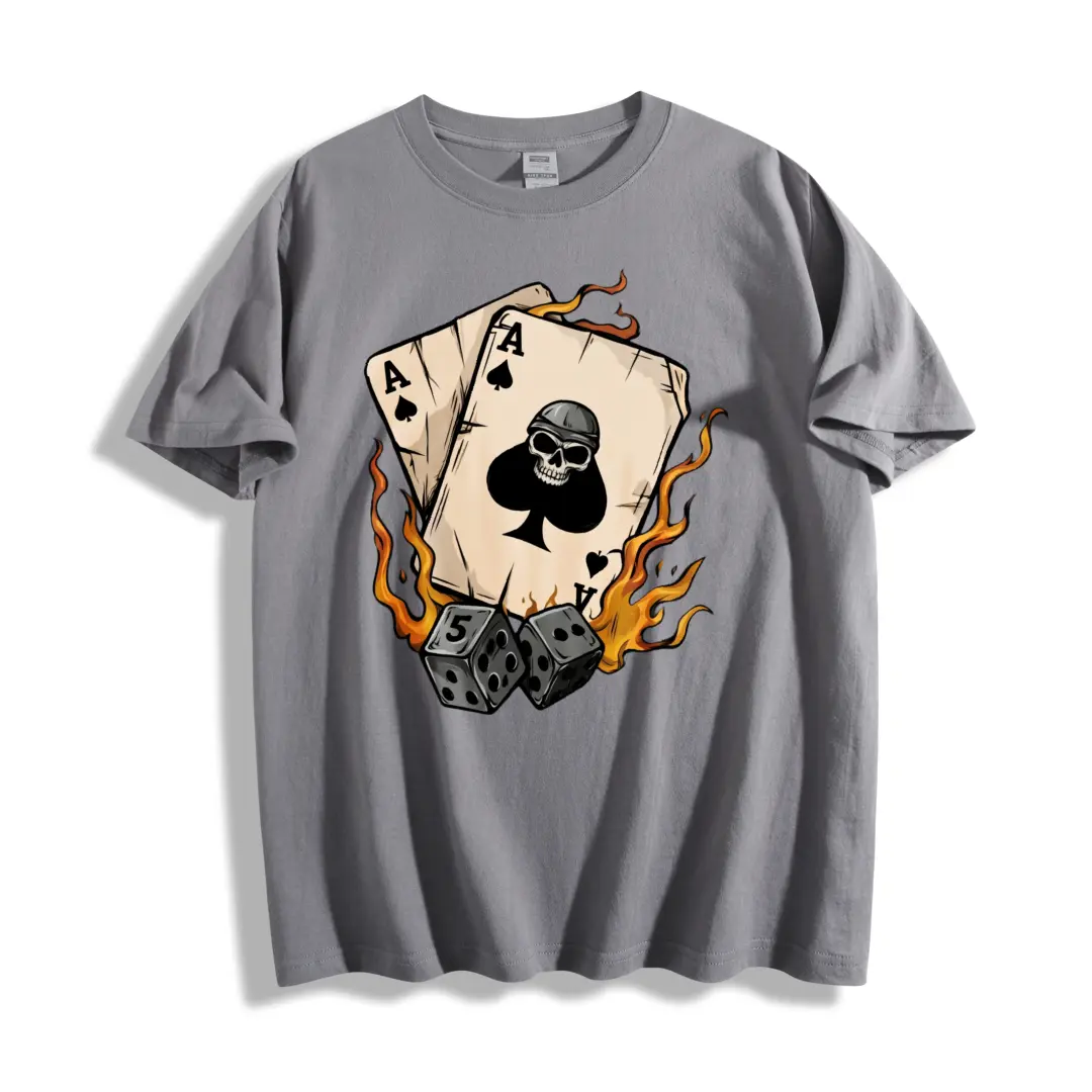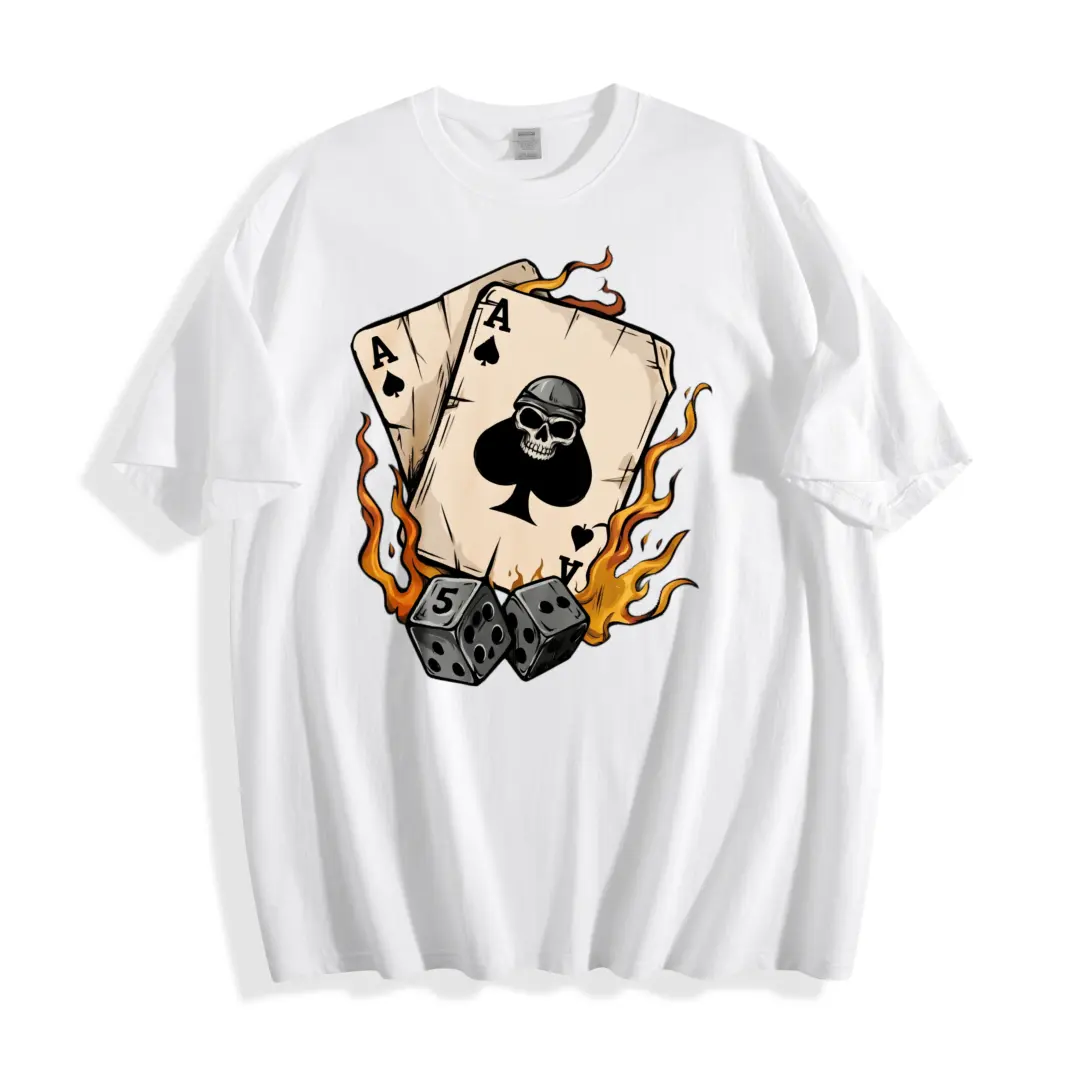 Casual Graphic Unisex T-Shirt With Ace Of Spades Skull And Dice Flames Design Perfect For Gaming Events Summer Wear Ideal Gift For Gamers And Poker EnthusiastsCasual Graphic Unisex T-Shirt With Ace Of Spades Skull And Dice Flames Design Perfect For Gaming Events Summer Wear Ideal Gift For Gamers And Poker Enthusiasts