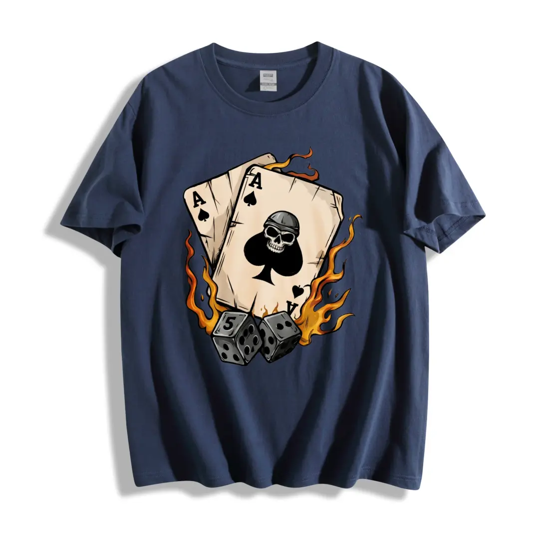 Casual Graphic Unisex T-Shirt With Ace Of Spades Skull And Dice Flames Design Perfect For Gaming Events Summer Wear Ideal Gift For Gamers And Poker Enthusiasts