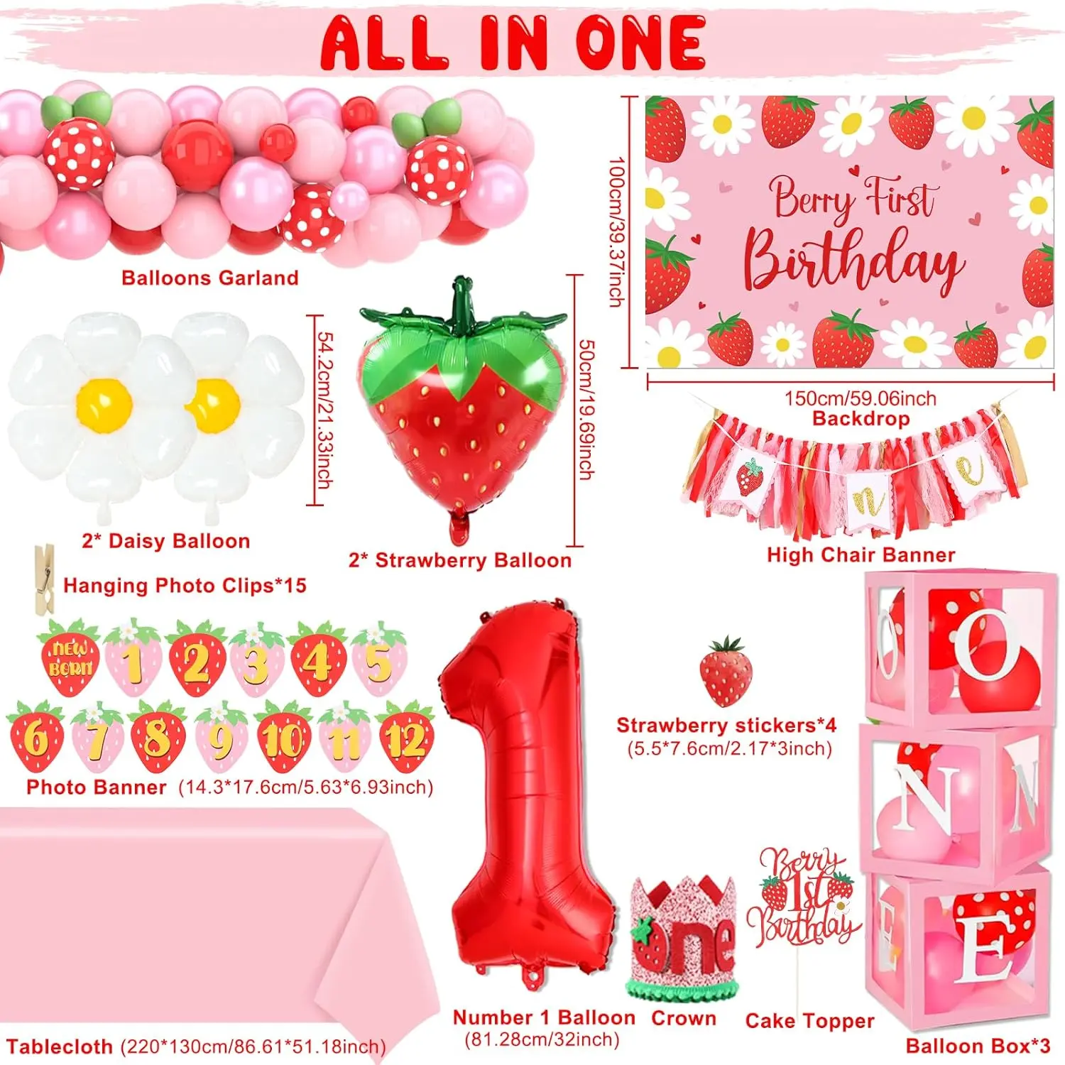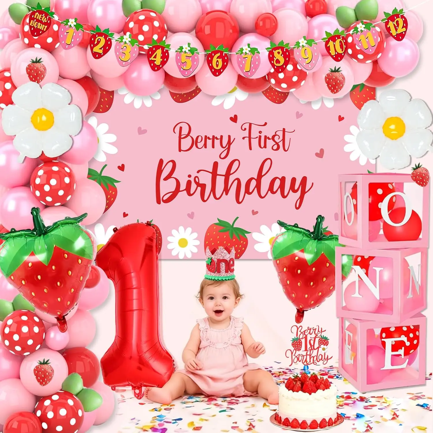 Create a sweet and charming celebration with a strawberry themed decoration set designed for a first birthday party.