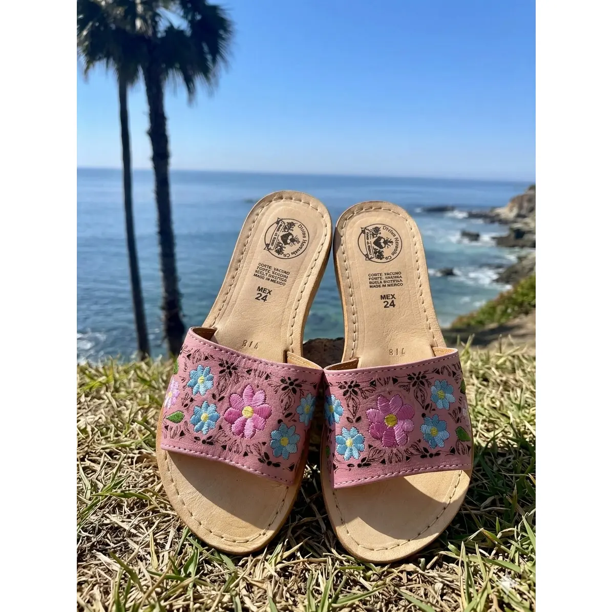 Effortless, feminine, and authentically Mexican. Our Divina Herencia Co "Primavera" slides are the ultimate celebration of color and tradition. Crafted from premium rose-toned leather, these slides feature vibrant hand-embroidered blossoms in shades of turquoise, magenta, and golden yellow. Whether you're strolling along the coast or enjoying a sunny brunch, these slides bring a garden-fresh pop of color to any look.