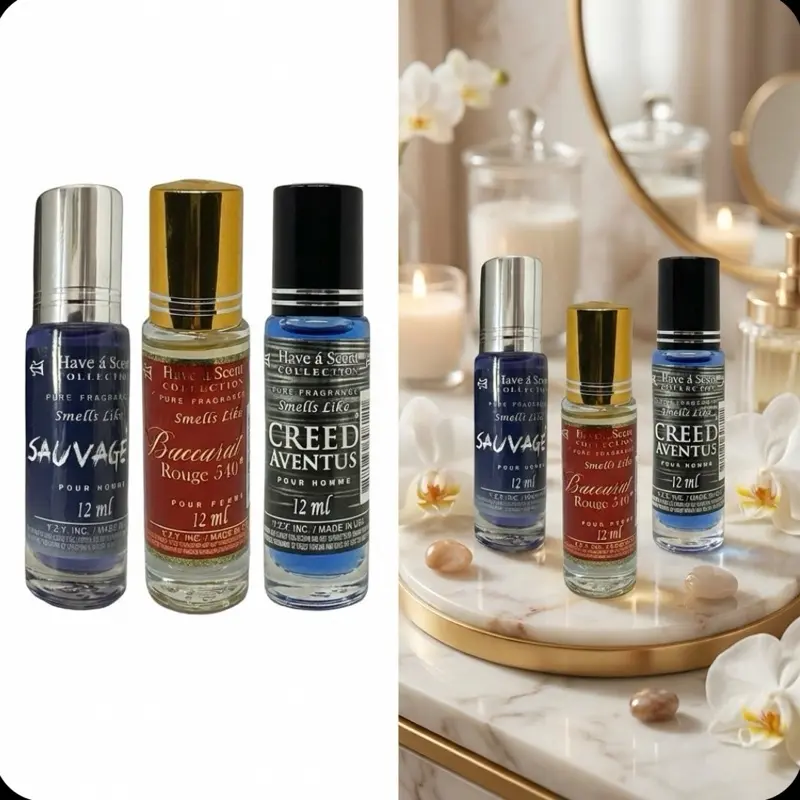 ✨ Elevate your fragrance game with our Perfume Oil Collection. This set includes oils that mimic the iconic scents of Baccarat Rouge 540, Sauvage, and Creed Aventus. Each bottle contains 12 ml of alcohol-free perfume oil. Perfect for those who love the essence of these renowned fragrances without the alcohol.