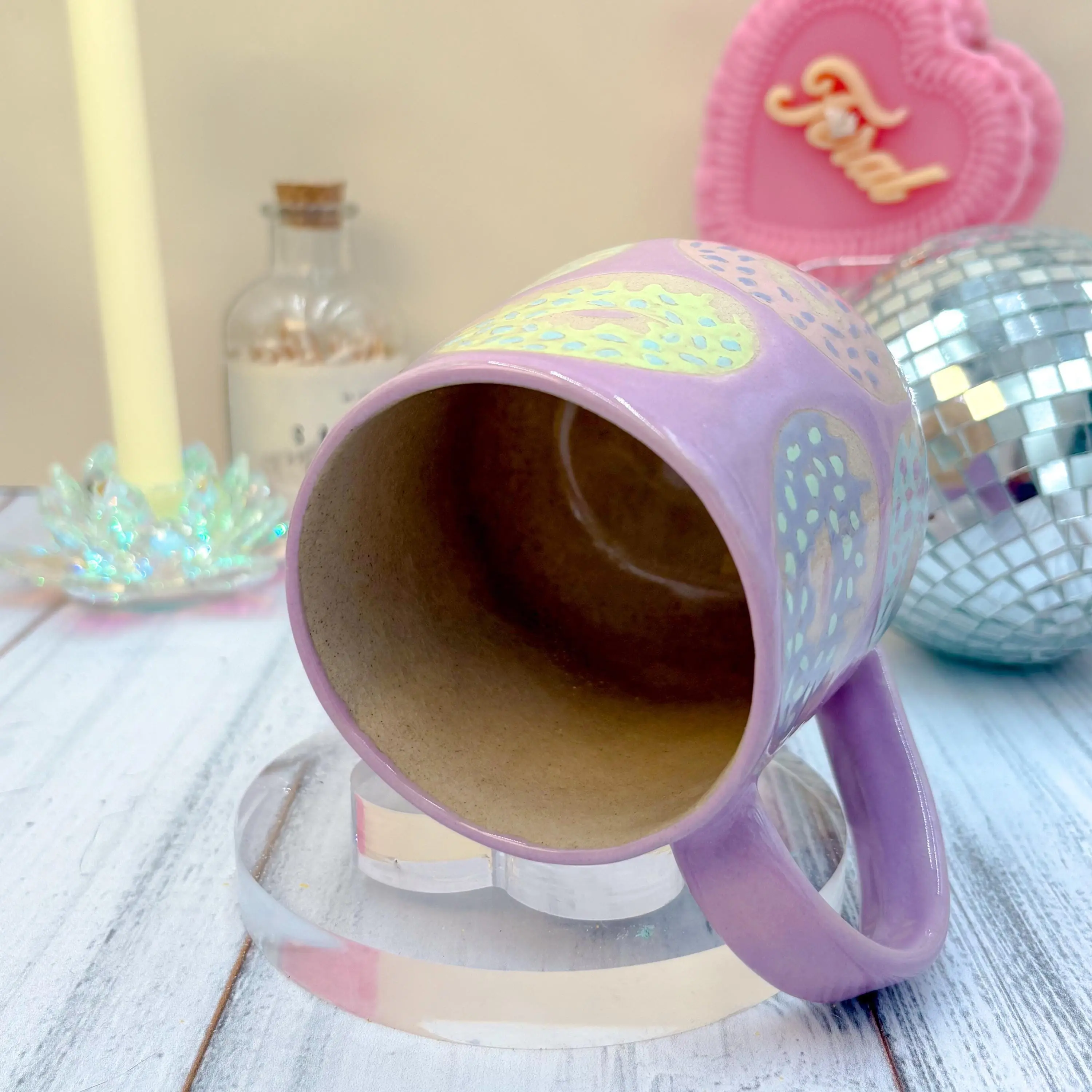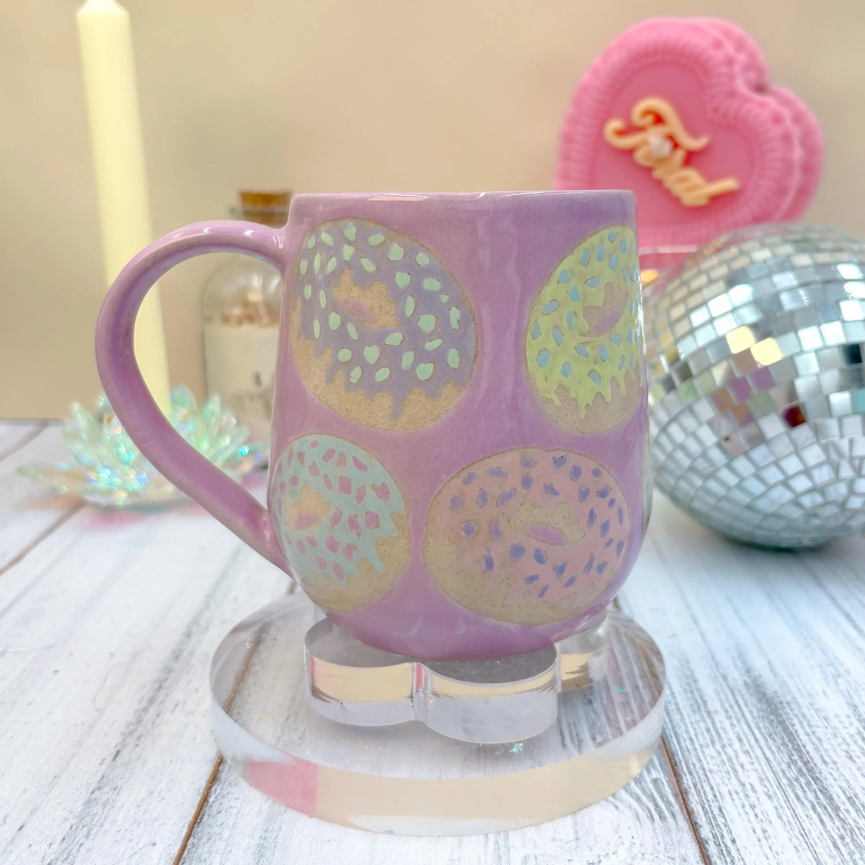 🍩The Donuts are a clear cone 6 glaze with an over glaze on top sealing the cone 6 stoneware underneath making the mug dishwater safe.