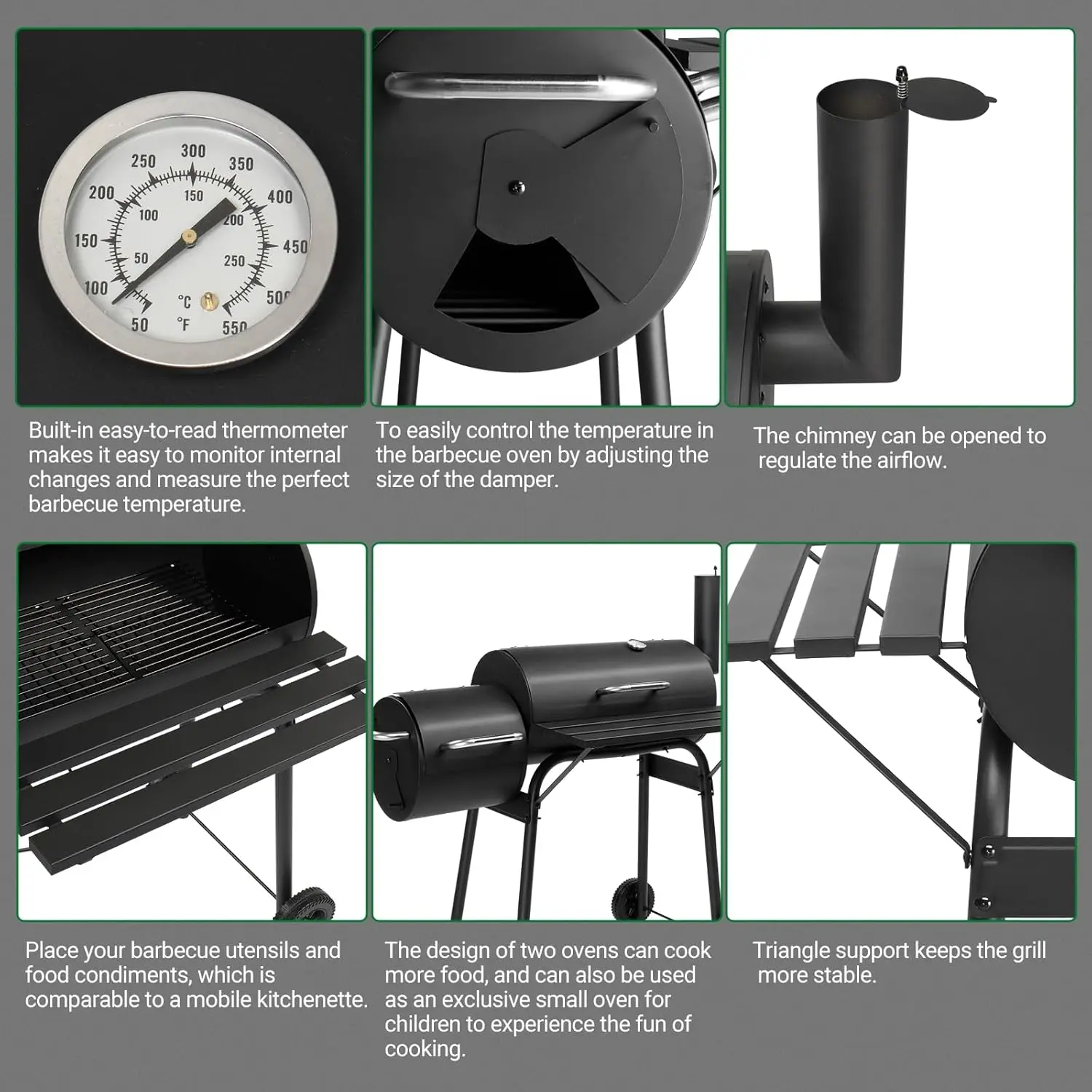 1. Offset Smoker for Extra Cooking Space: Enhance your grilling versatility with the seamlessly attached offset smoker. This additional chamber provides extra space for grilling or smoking smaller side dishes, ensuring you can prepare a full meal in one go.