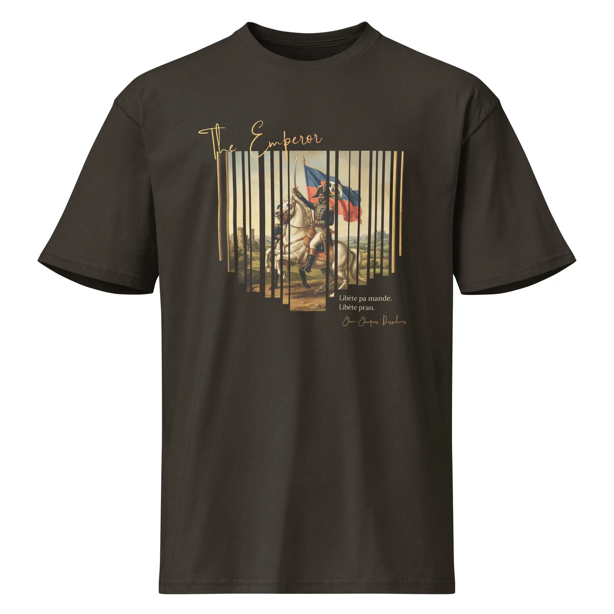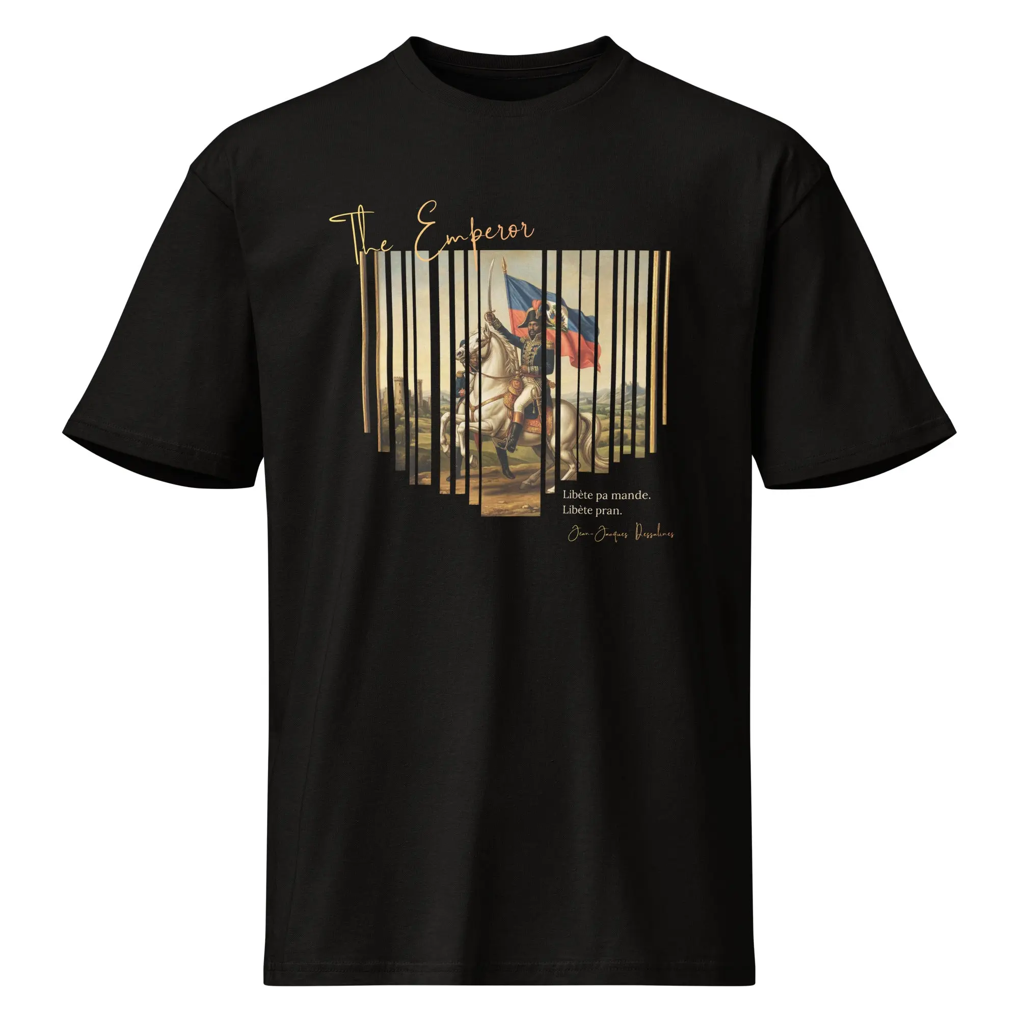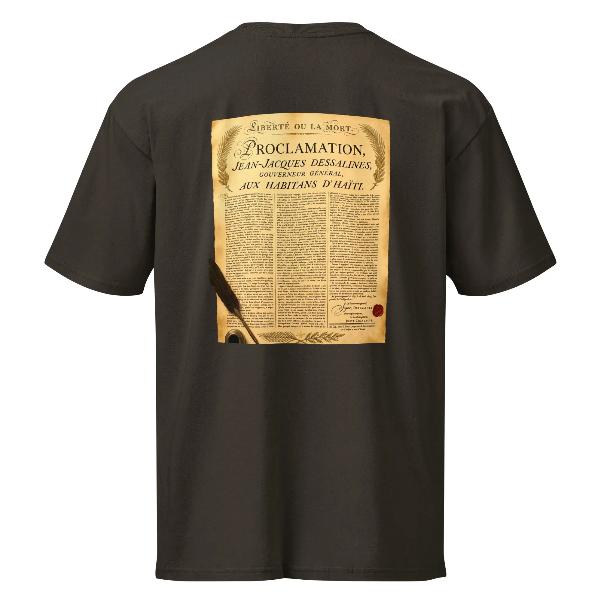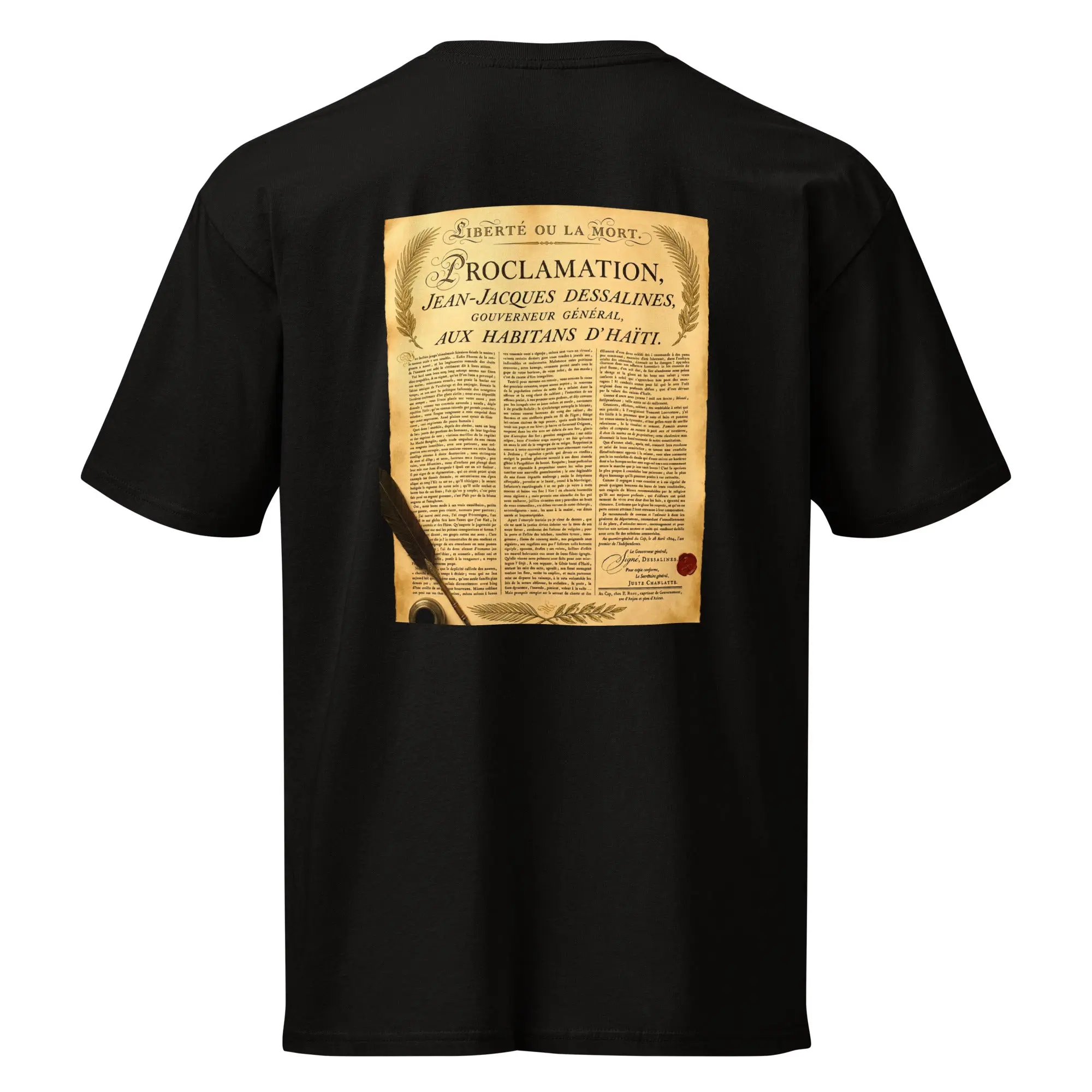 A tribute to Jean-Jacques Dessalines and the declaration that changed history. The back print carries the voice of 1804 — bold, unapologetic, and eternal.