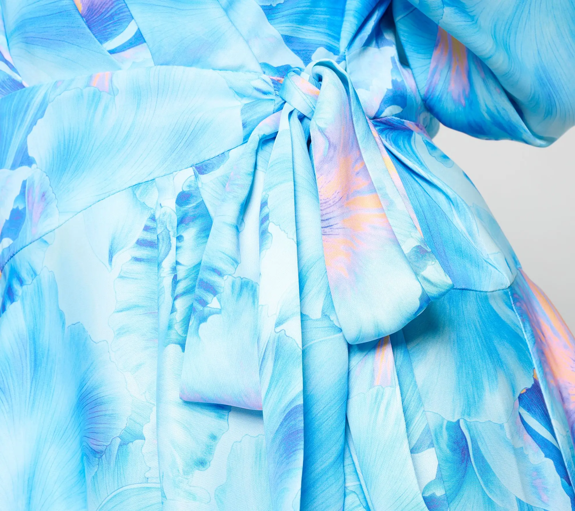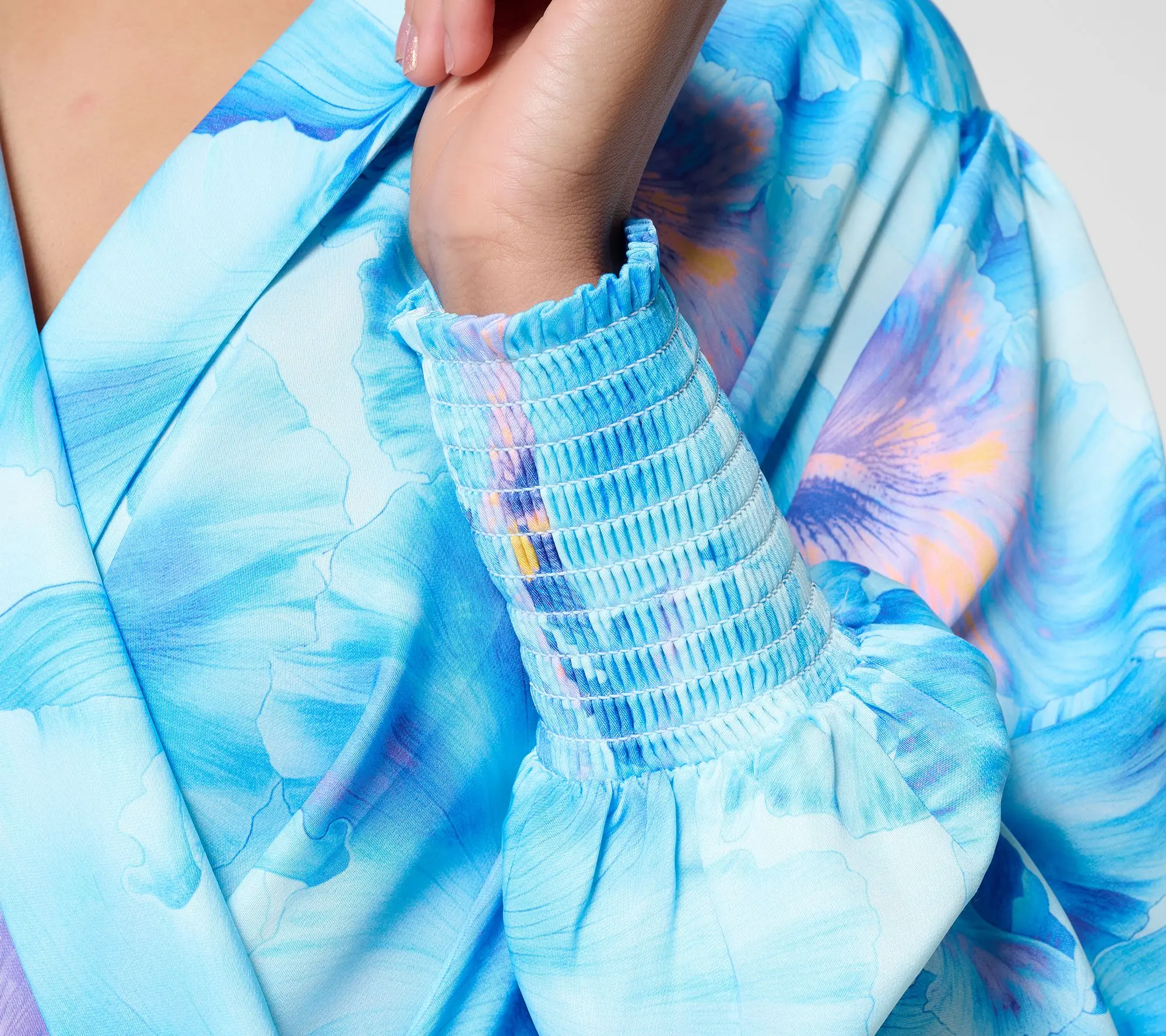·Features: wrap style with self ties, hidden button at waist, shawl collar, soft pleats, full blouson sleeves with smocked cuff, uneven hem, draped bodice