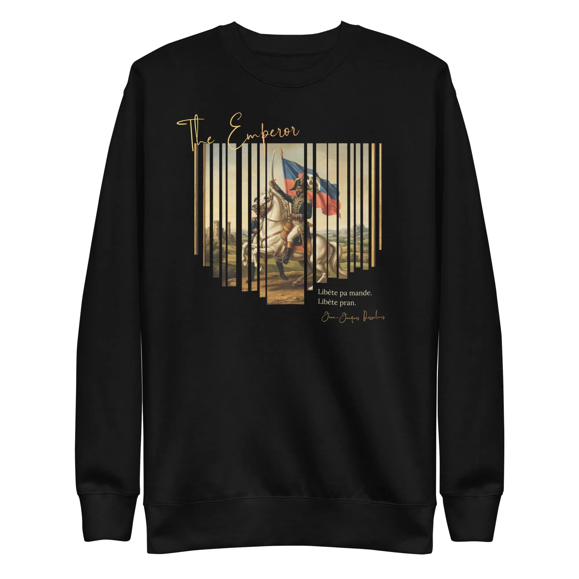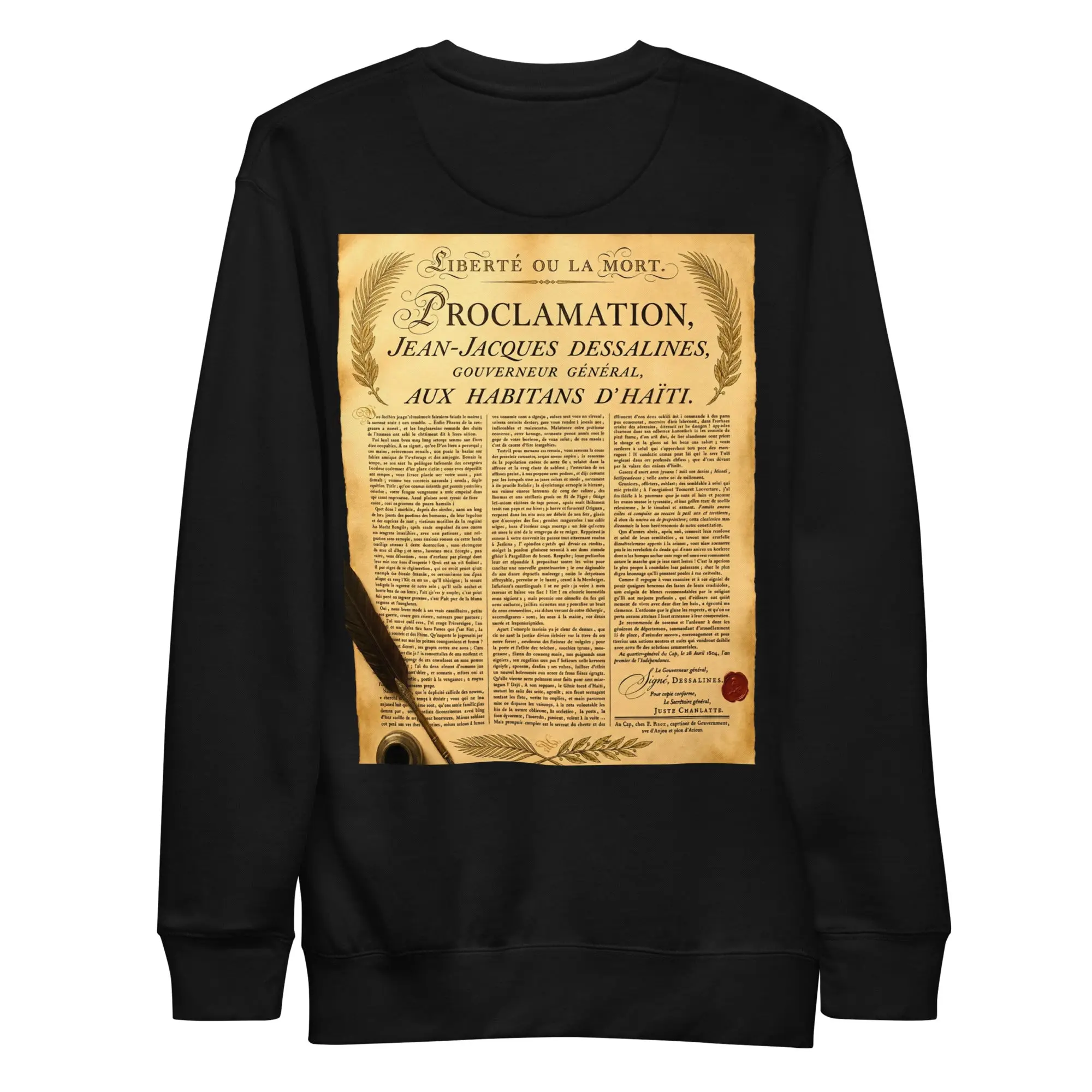 A tribute to Jean-Jacques Dessalines and the declaration that changed history. The back print carries the voice of 1804 — bold, unapologetic, and eternal.