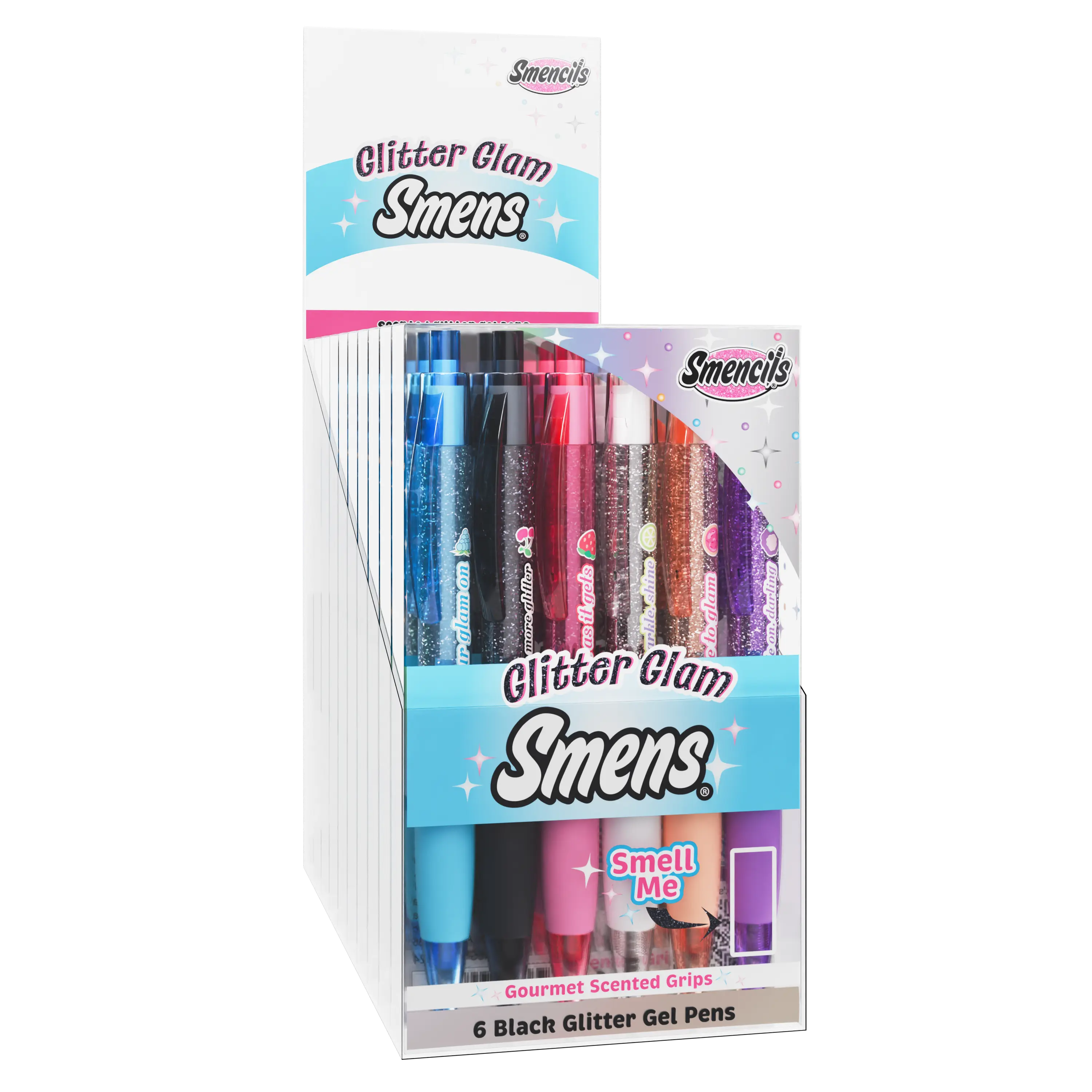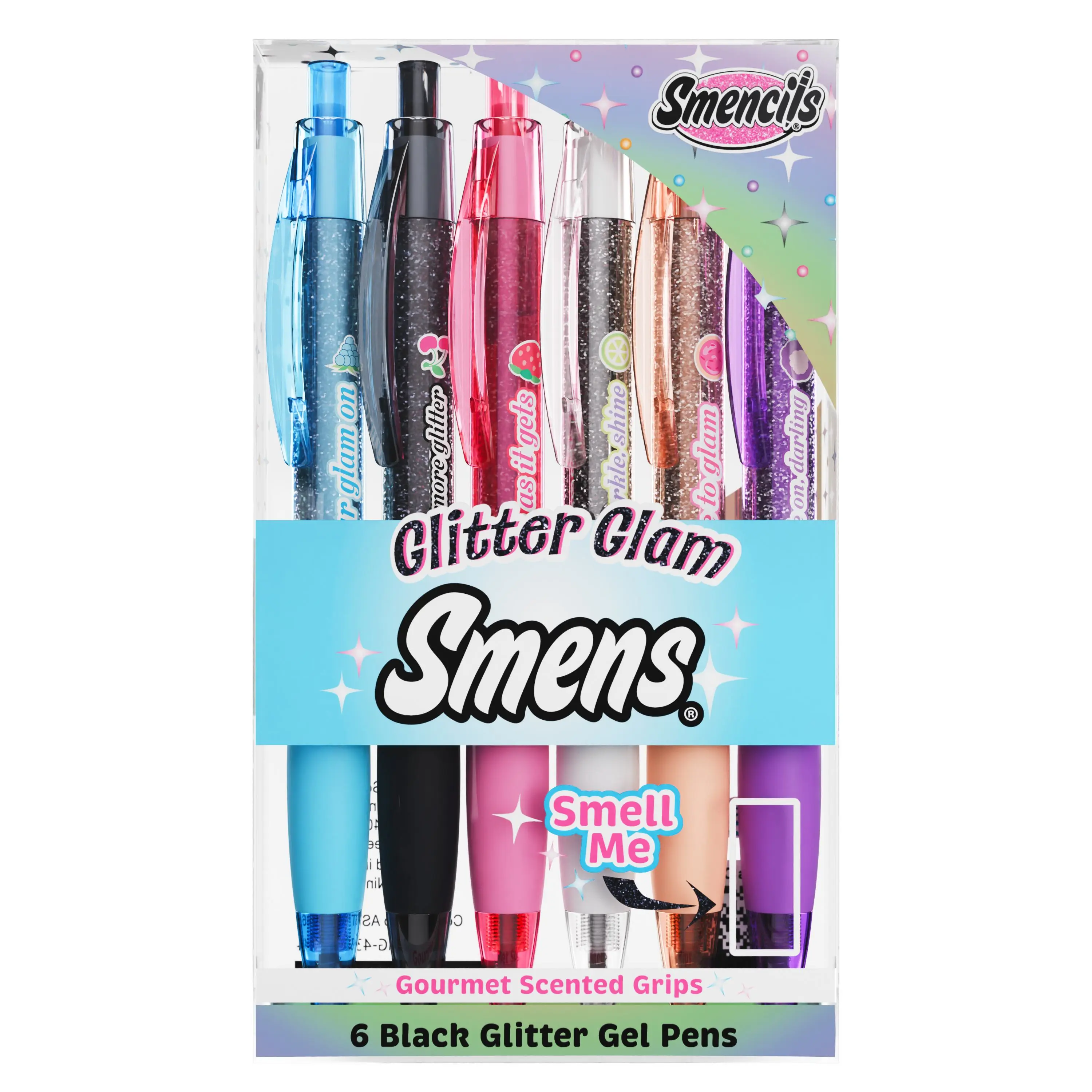 Add sparkle to every word. Glitter Glam Smens® feature smooth black glitter gel ink and six bold fragrances infused directly into the grip for a fun, sensory writing experience. Perfect for school supplies, journaling, crafts, and creative projects.