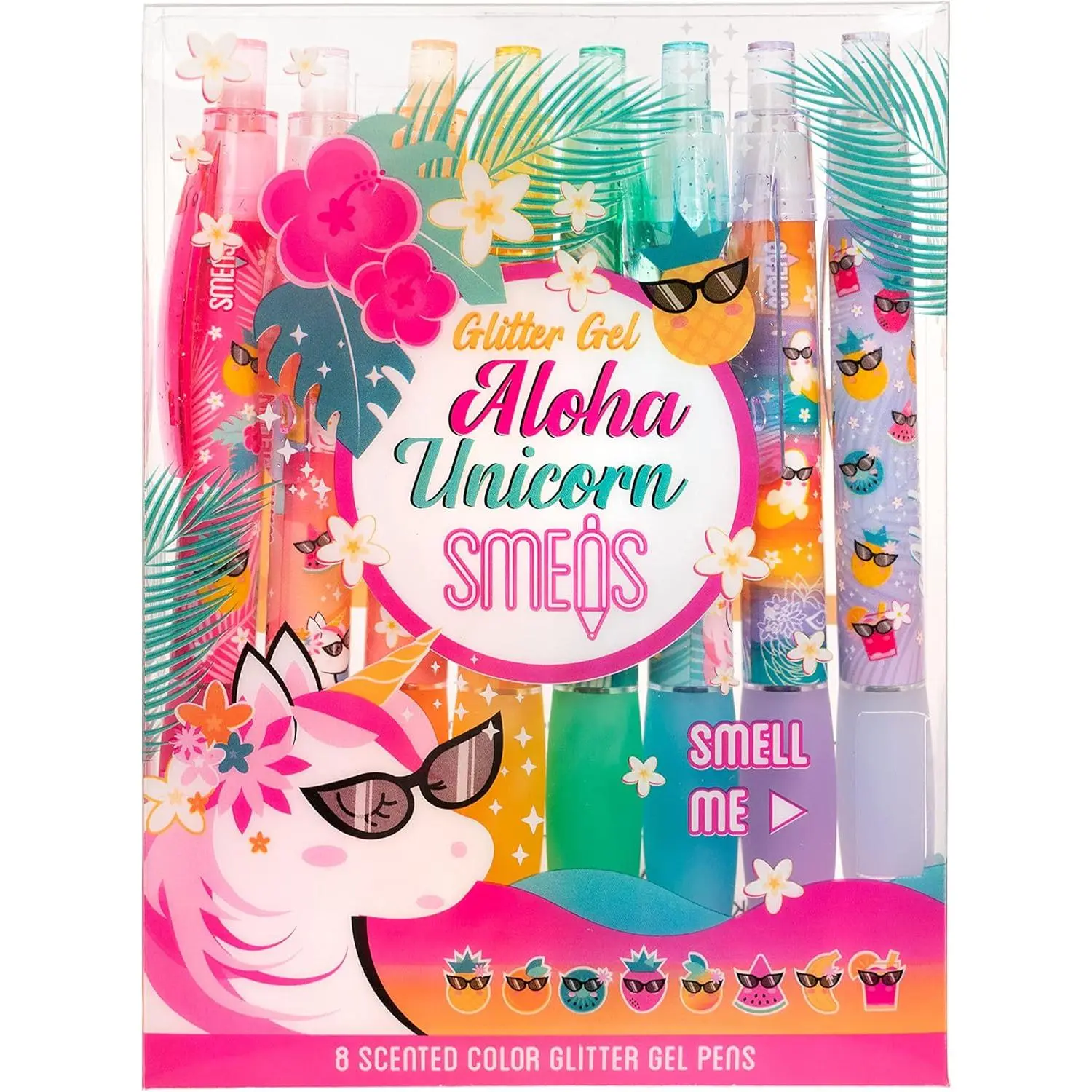 Aloha Unicorn Glitter Gel Smens® bring sparkle, scent, and tropical vibes to every page. This 8-pack of clickable pens features colorful glitter gel ink and patented scented grips that release fruity fragrances while you write.