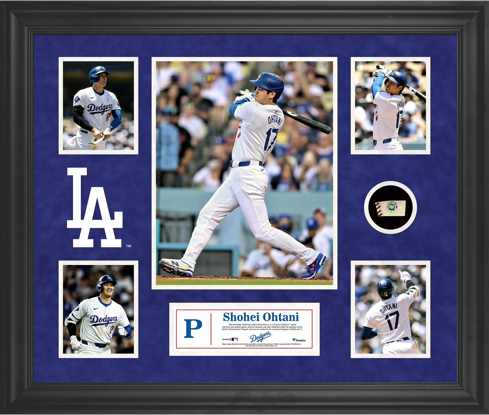 Shohei Ohtani Los Angeles Dodgers Framed 5-Photo Collage with a Piece of Game-Used Ball If a product is unsigned or non game-used, a hologram will not be included Shohei Ohtani memorabilia. Los Angeles Dodgers memorabilia.