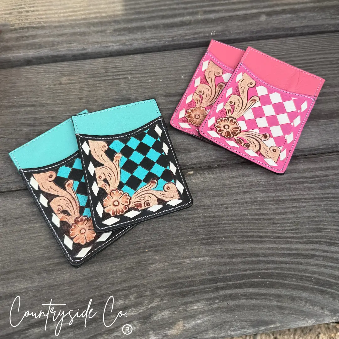 Belle Checkered Tooled Leather Credit Card Holder Details: