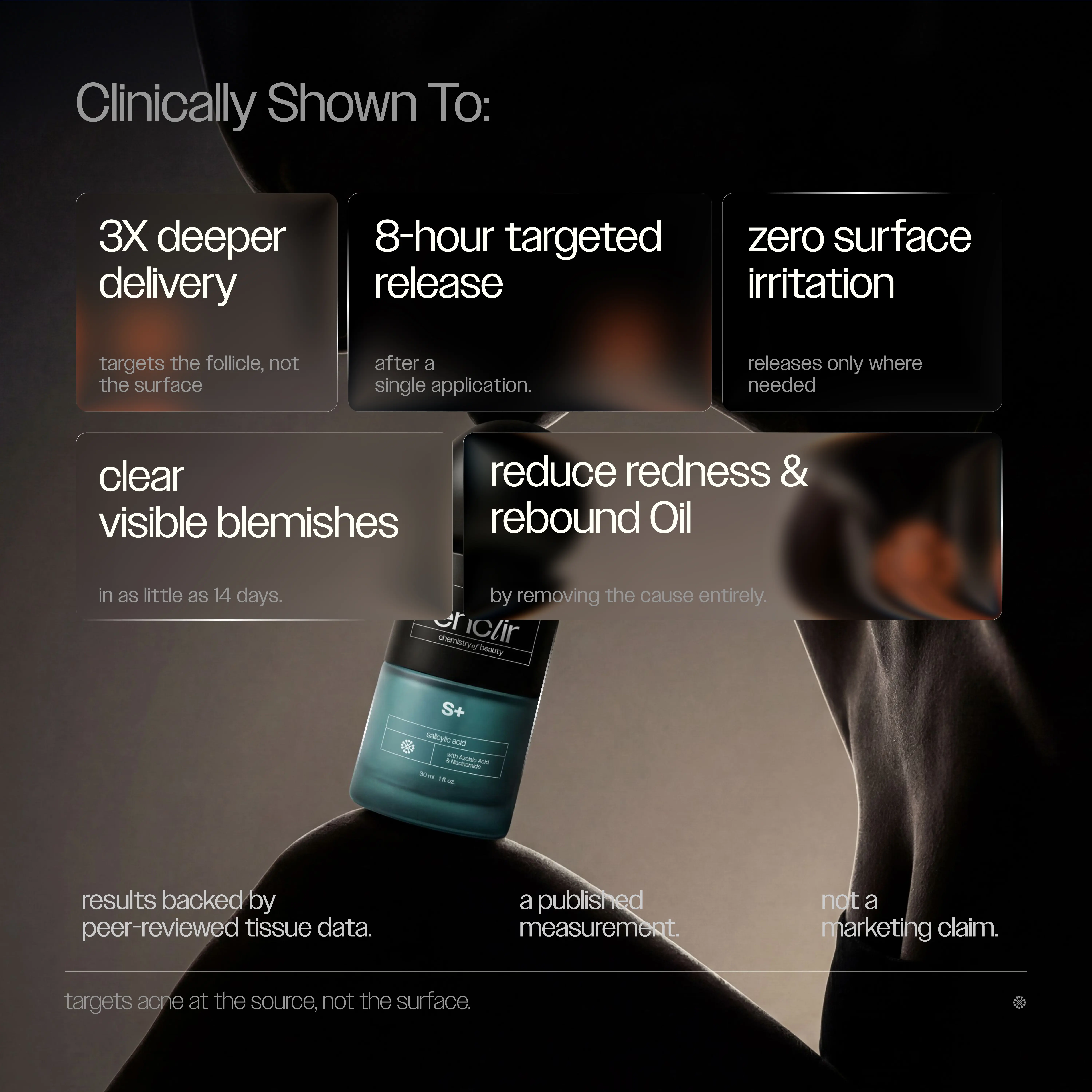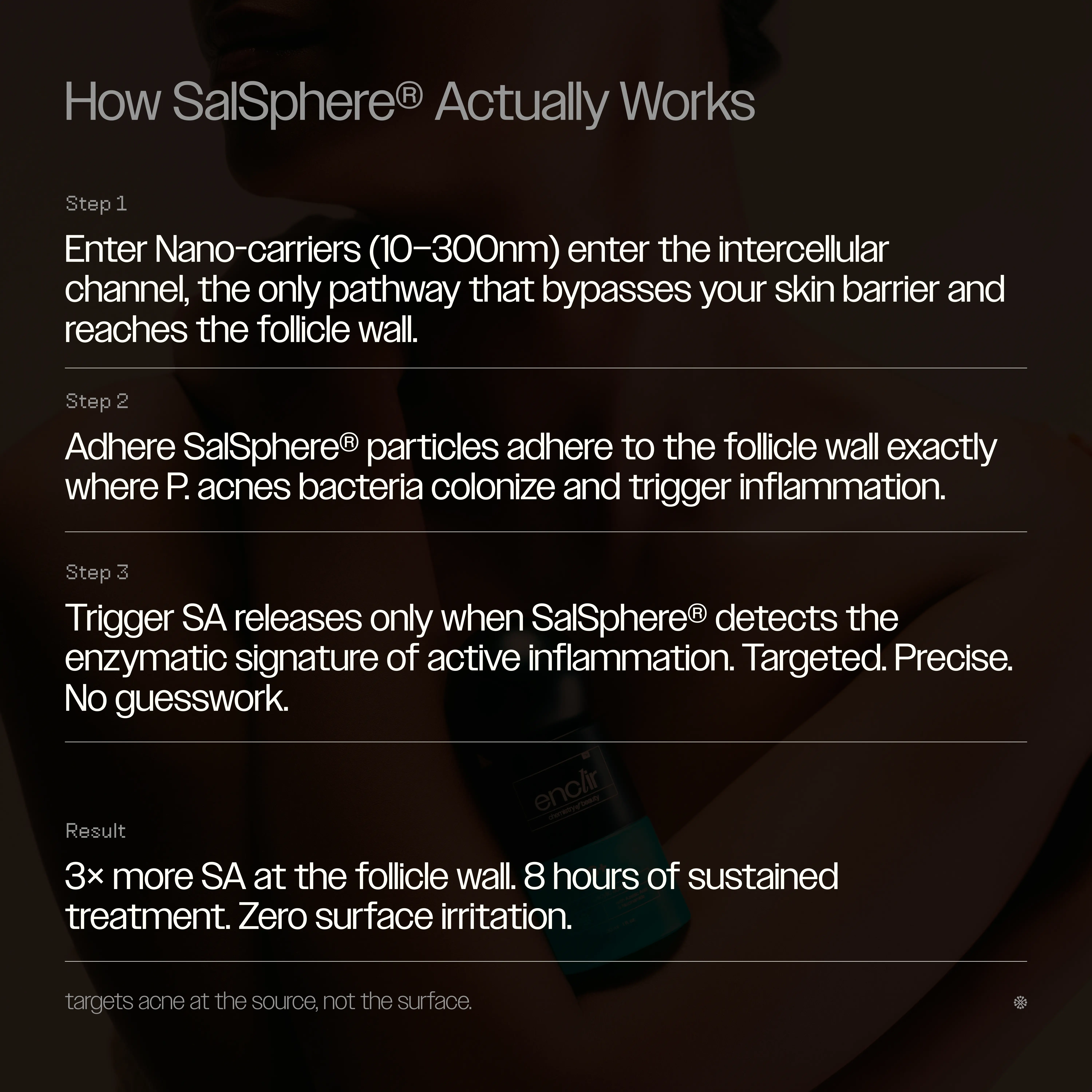 Powered by Salsphere technology, salicylic acid 2% is encapsulated into sub-micron carriers that adhere to the follicle wall and release only upon detecting enzymatic activity associated with active inflammation. Independent tissue deposition data shows 3× greater SA at the follicle wall compared to conventional free-form salicylic acid at equivalent concentration.*