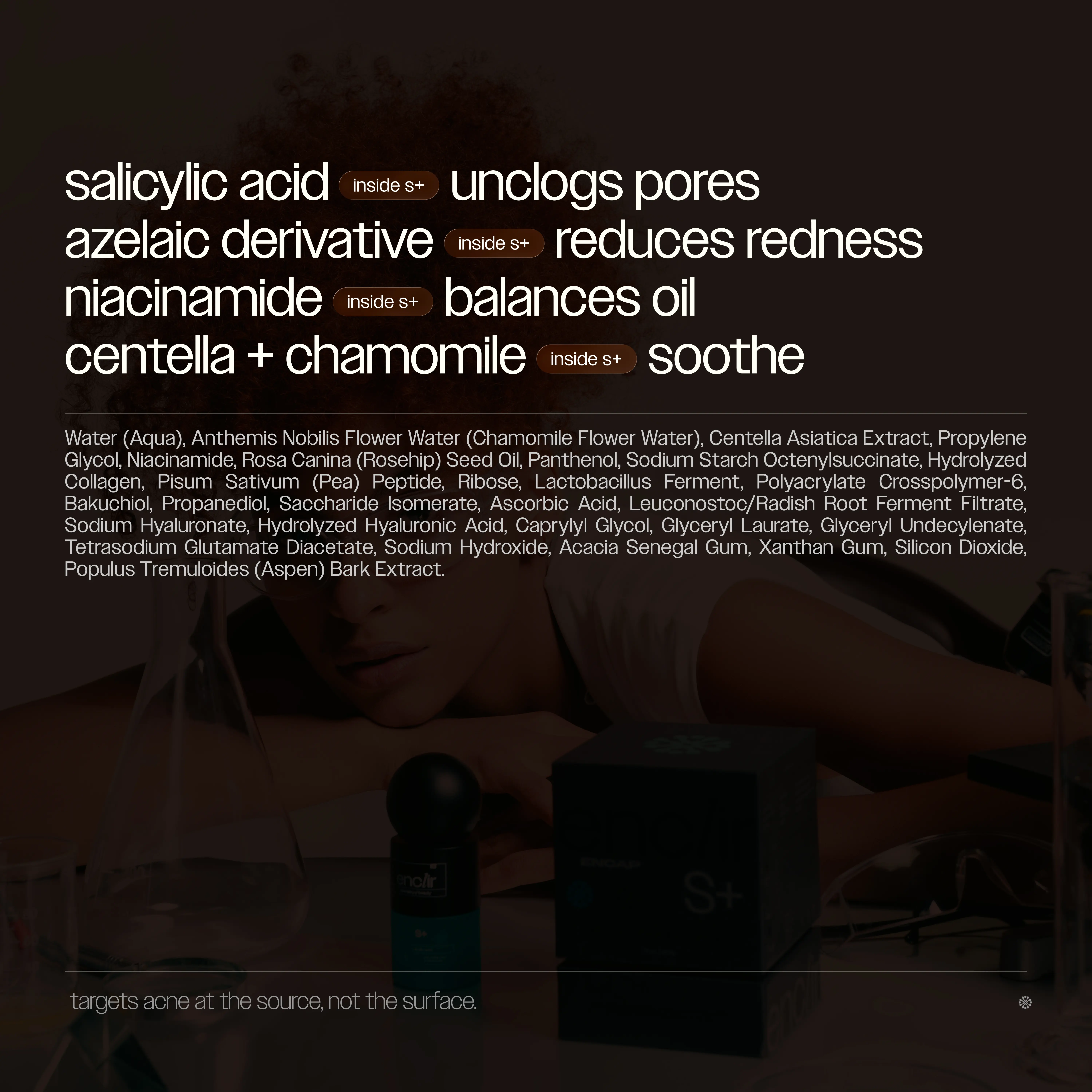 Key actives and their roles: — Salsphere Salicylic Acid 2%: follicle-targeted BHA with sustained 8-hour release profile — Azeclair 2% (potassium azeloyl diglycinate): azelaic acid derivative supporting even skin tone and sebum balance — Ectoin 1%: extremolyte shown to support cell membrane protection against environmental oxidative stress — Centella Asiatica 5%: supports skin recovery and comfort during active treatment — Roman Chamomile Hydrosol 20%: chamomile-water base in place of plain aqua — Panthenol 2% + Allantoin: barrier-supporting actives to maintain skin comfort — Sodium Hyaluronate: hydration retention during treatment