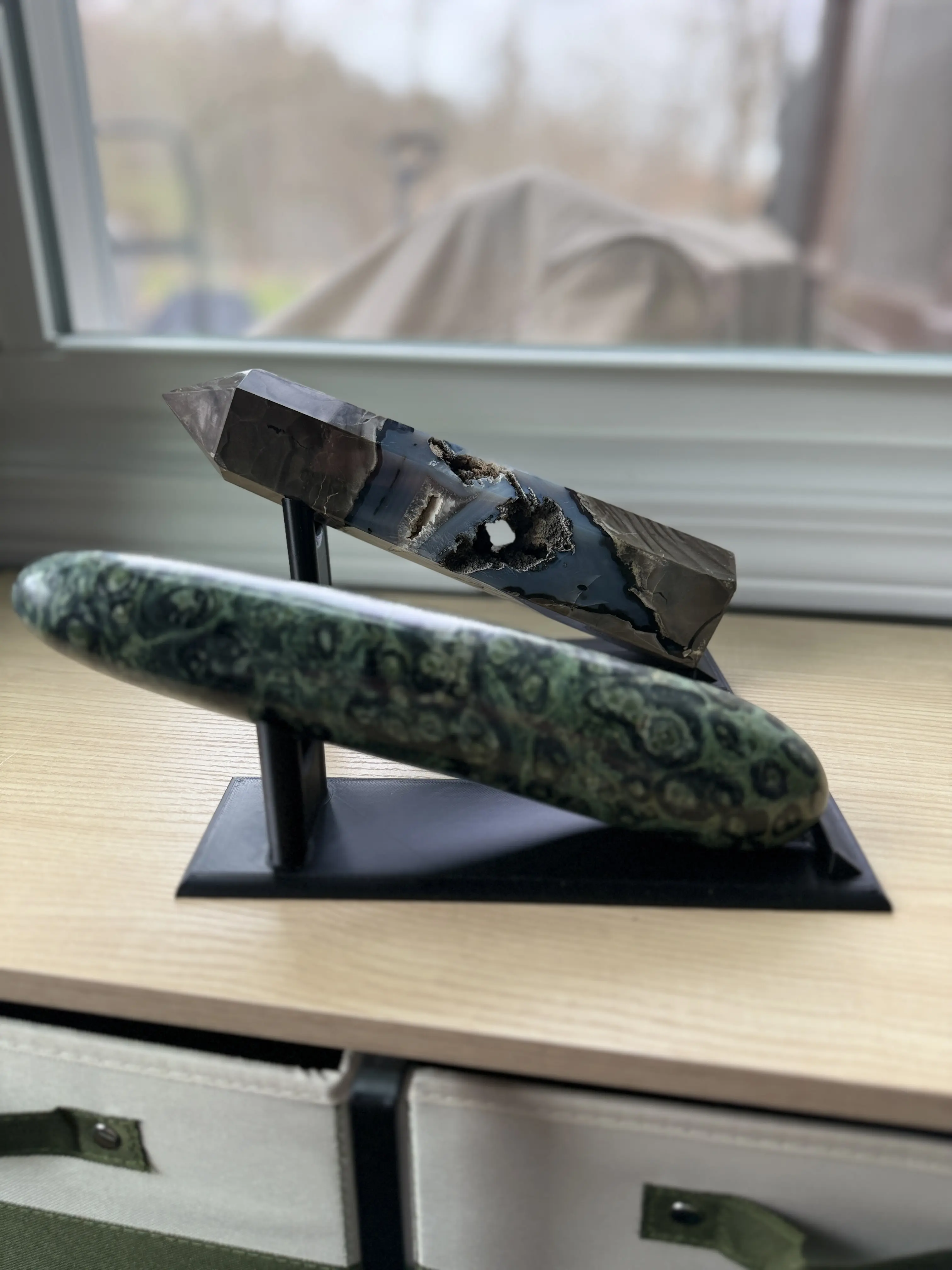 Pictured on Tall Stand is a Kambaba that is 10" long and a volcano agate tower that is 8.5" long