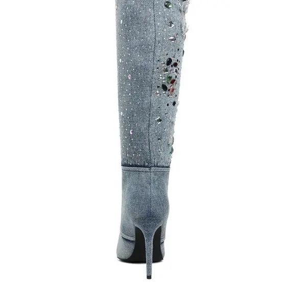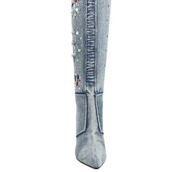Cornik Multi Color Stones Denim Boots with Rhinestones and Distressed Design