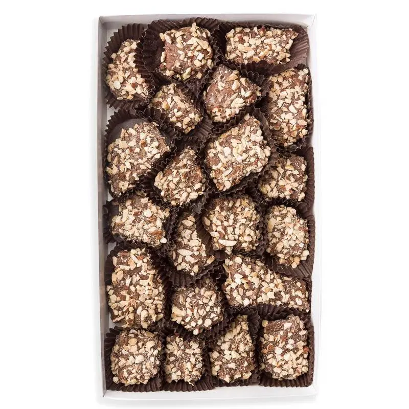 A confection that embodies the perfect balance of sweet toffee flavor and nutty goodness, enveloped in silky-smooth melted chocolate and sprinkled with crunchy almond bits.