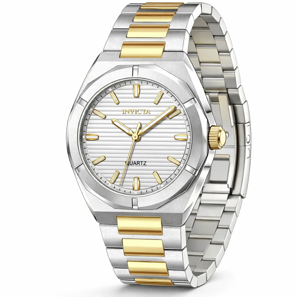 Refined and versatile, the Invicta Celestial features a balanced 42mm stainless steel case with elegant gold-tone accents and a textured silver dial. Applied gold-tone markers and hands provide clean contrast and easy readability. Powered by a reliable quartz movement and paired with a comfortable two-tone bracelet, it’s built for everyday wear with a polished finish.
