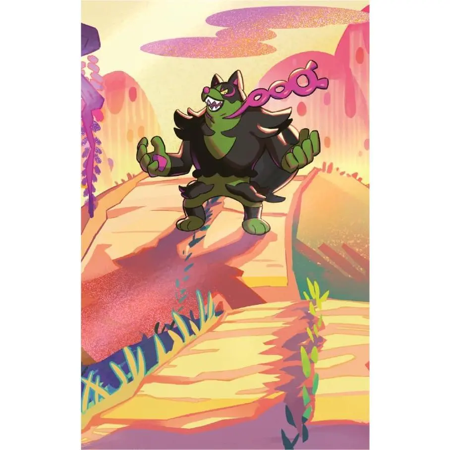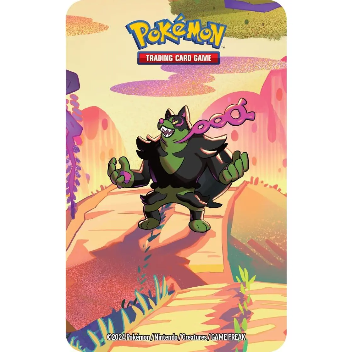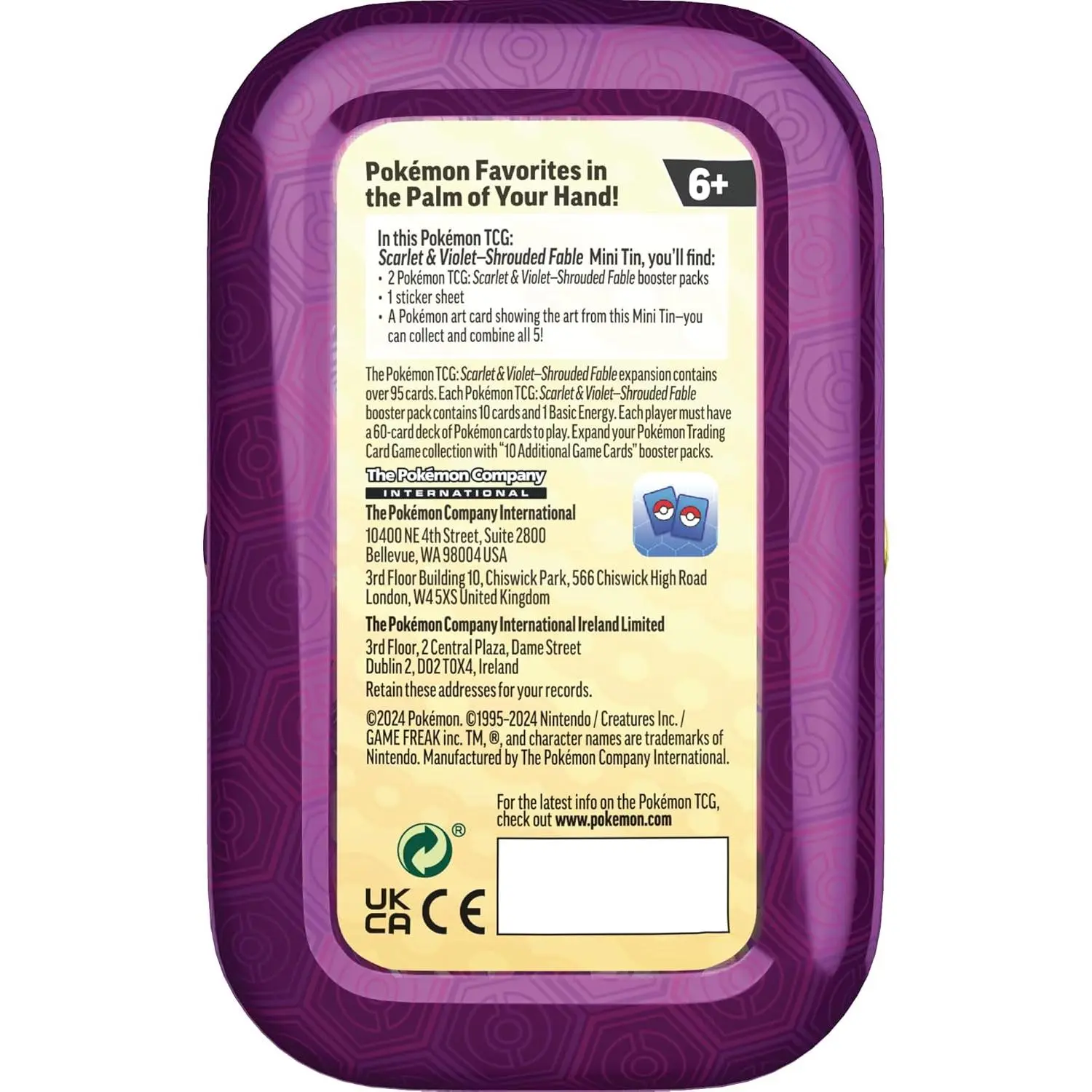 Perfectly sized for taking your favourite 60-card deck on the go (unsleeved), this fantastic Mini Tin features a fun illustration and includes 2 Pokémon TCG: Scarlet & Violet—Shrouded Fable booster packs, 1 sticker sheet and and art card.