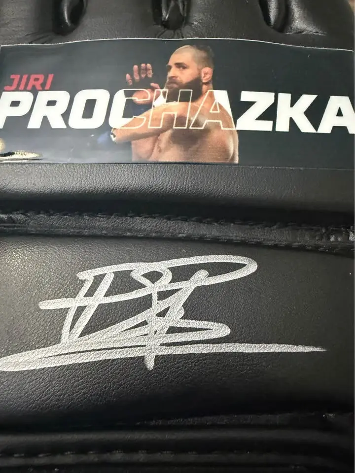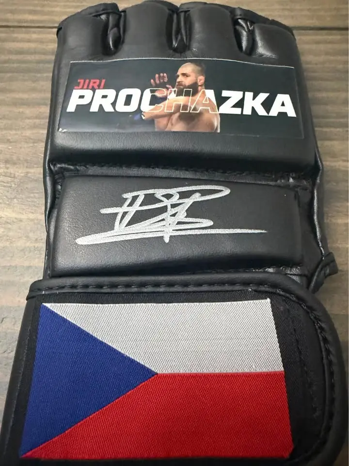 Own an awesome piece of UFC history with this Jiri Prochazka autographed MMA glove, signed clean in silver paint pen! This glove features a Czech Republic flag strap and a nameplate that reads βJiri Prochazkaβ, making it a perfect display piece for any MMA collector or UFC fan.