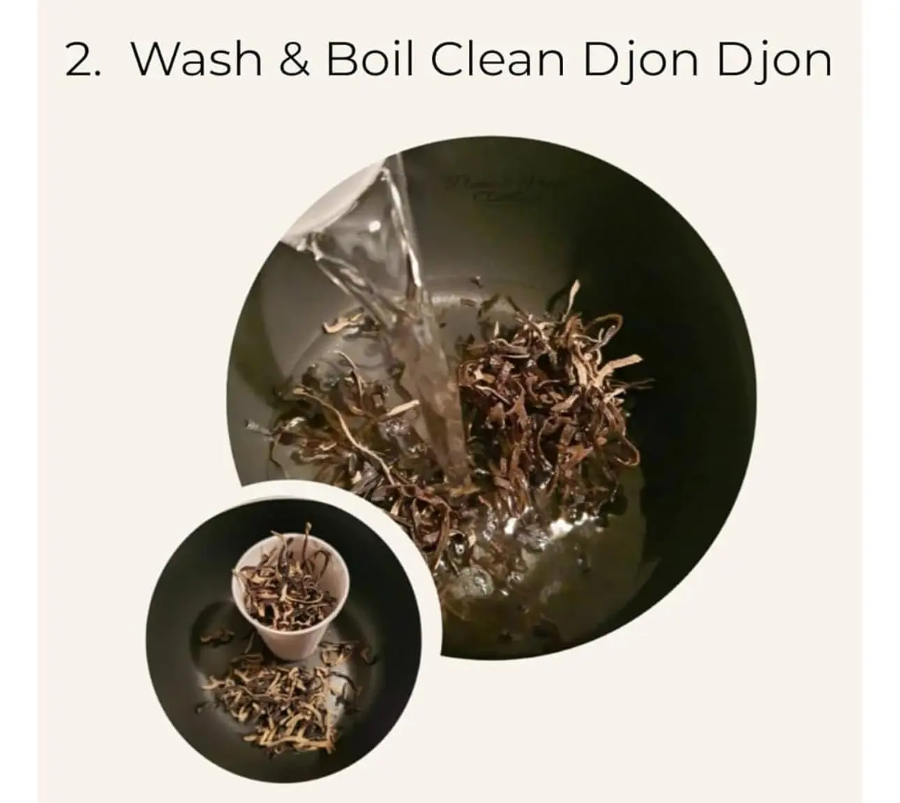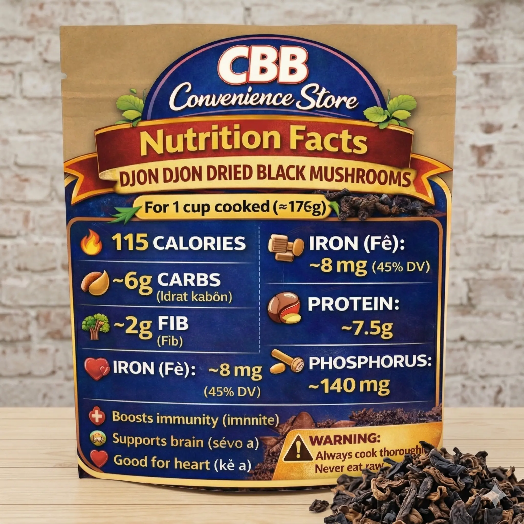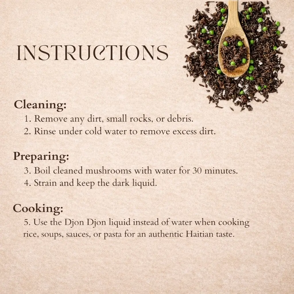 ·Experience the authentic taste of Haiti with Djon Djon, the black mushroom that gives Riz Djon Djon its signature dark color and rich flavor. Each batch is handpicked and naturally sun-dried to preserve its deep aroma. Use Djon Djon to enhance rice, soups, stews, sauces, and seafood dishes. Available in two versions: Unclean Djon Djon: Contains more natural soil residue and requires thorough cleaning before use. Pre-Cleaned Djon Djon: Lightly cleaned for easier preparation but should still be rinsed before soaking. All-natural and vegan, with no preservatives or additives. Bring home the true taste of Haitian cuisine. Directions 1- Gently shake or rinse mushrooms to remove visible dirt. 2- Soak in warm water for 20–30 minutes until ened and the water turns dark. 3- Strain and reserve the dark soaking liquid (Djon Djon broth). 4- Use the broth to cook rice, soups, or sauces for an authentic Haitian flavor.