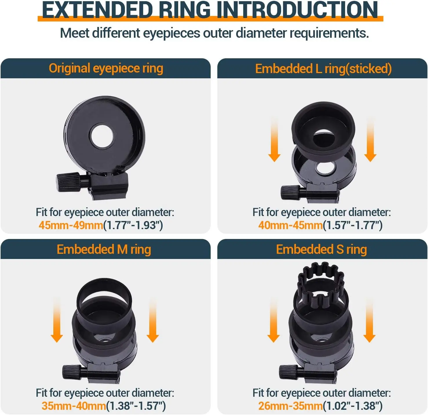 ·Compatible with eyepieces whose outer diameters are ranging from 28mm to 49mm. Better fit for different sizes of eyepieces and not easy to fall off any more.
