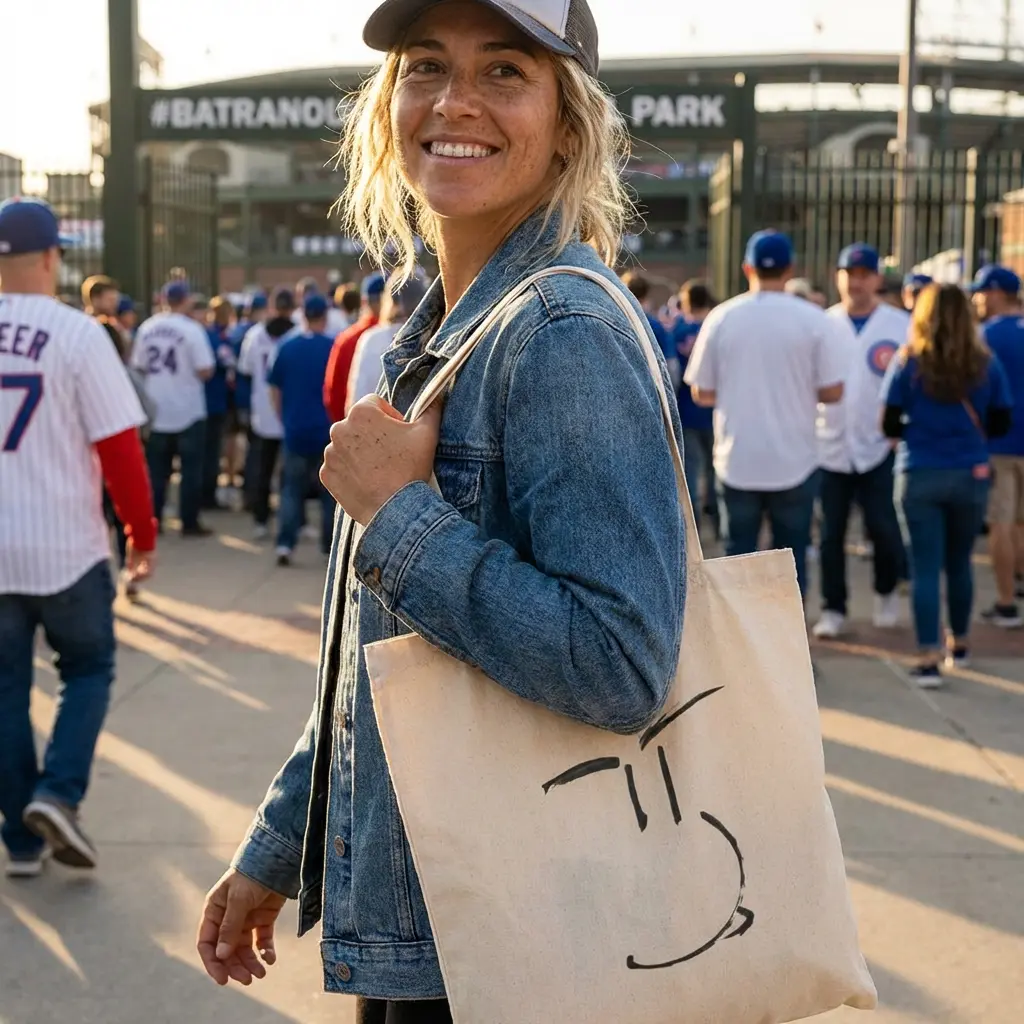 A lived-in canvas tote that feels like a small, knowing smile. Hand-drawn brush strokes form a minimal face on a heavy natural canvas, so this bag slips into morning routines without shouting. It carries groceries, sketchbooks, and secret finds with equal calm — the reinforced handles and sturdy 12 oz fabric stand up to daily use. The pared-down design reads as artful and quiet; it suits someone who values simplicity, subtle humor, and objects that age gracefully.