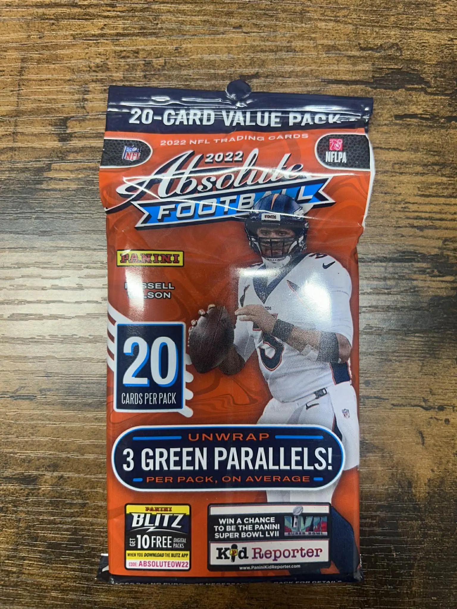 Get ready to experience the excitement of Panini's 2022 Absolute Football with this value pack that contains 20 sealed trading card packs. These cards feature top players and athletes such as Aidan Hutchinson, Malik Willis, Garrett Wilson, and Kenny Pickett, and come in standard size with a card stock material.