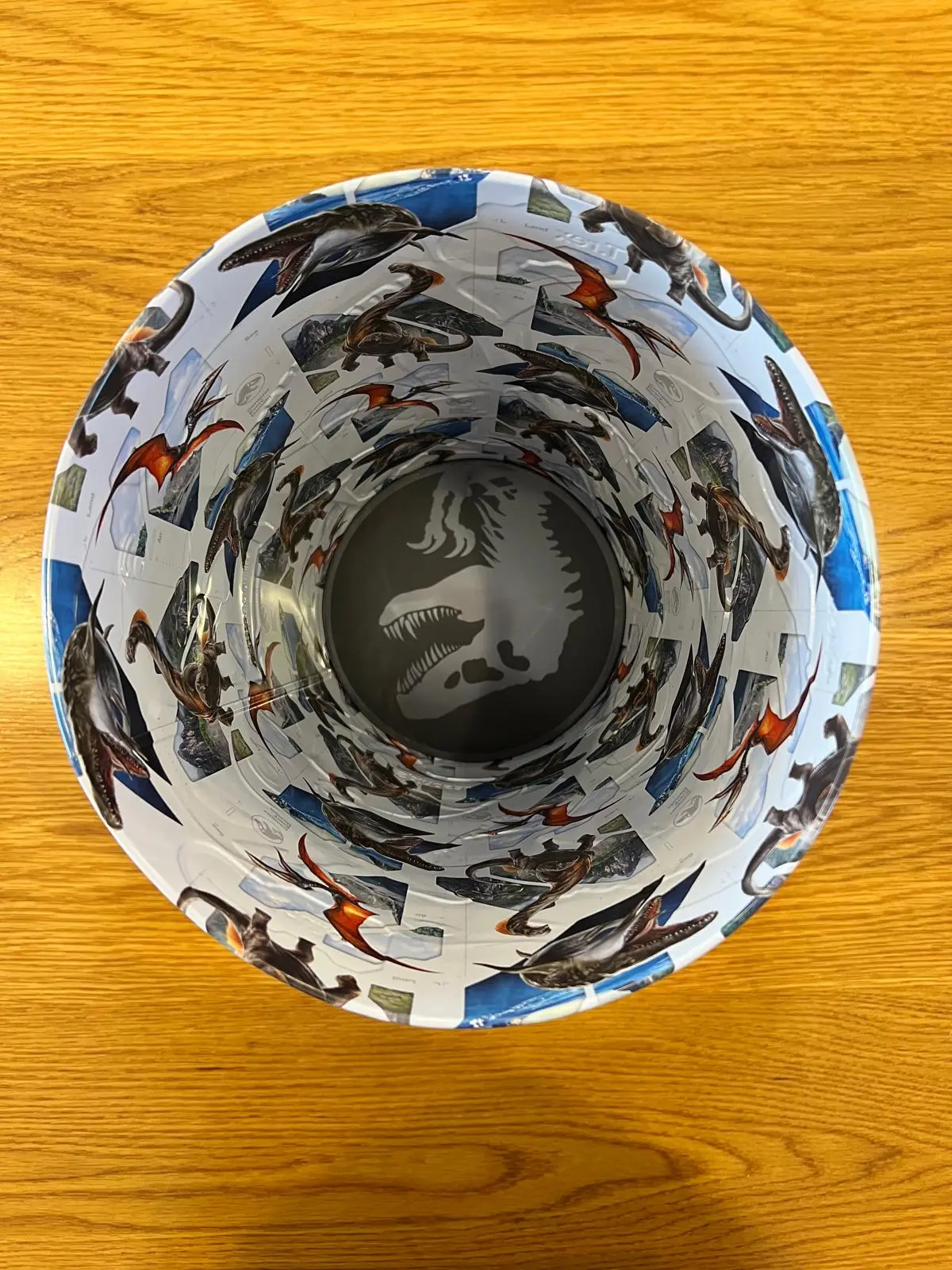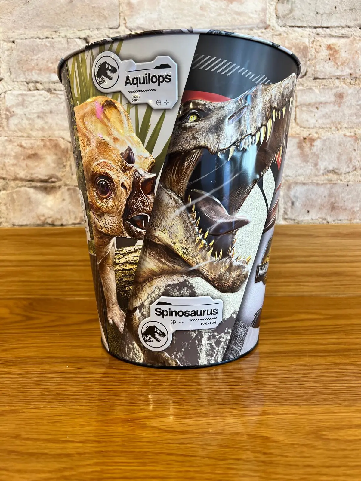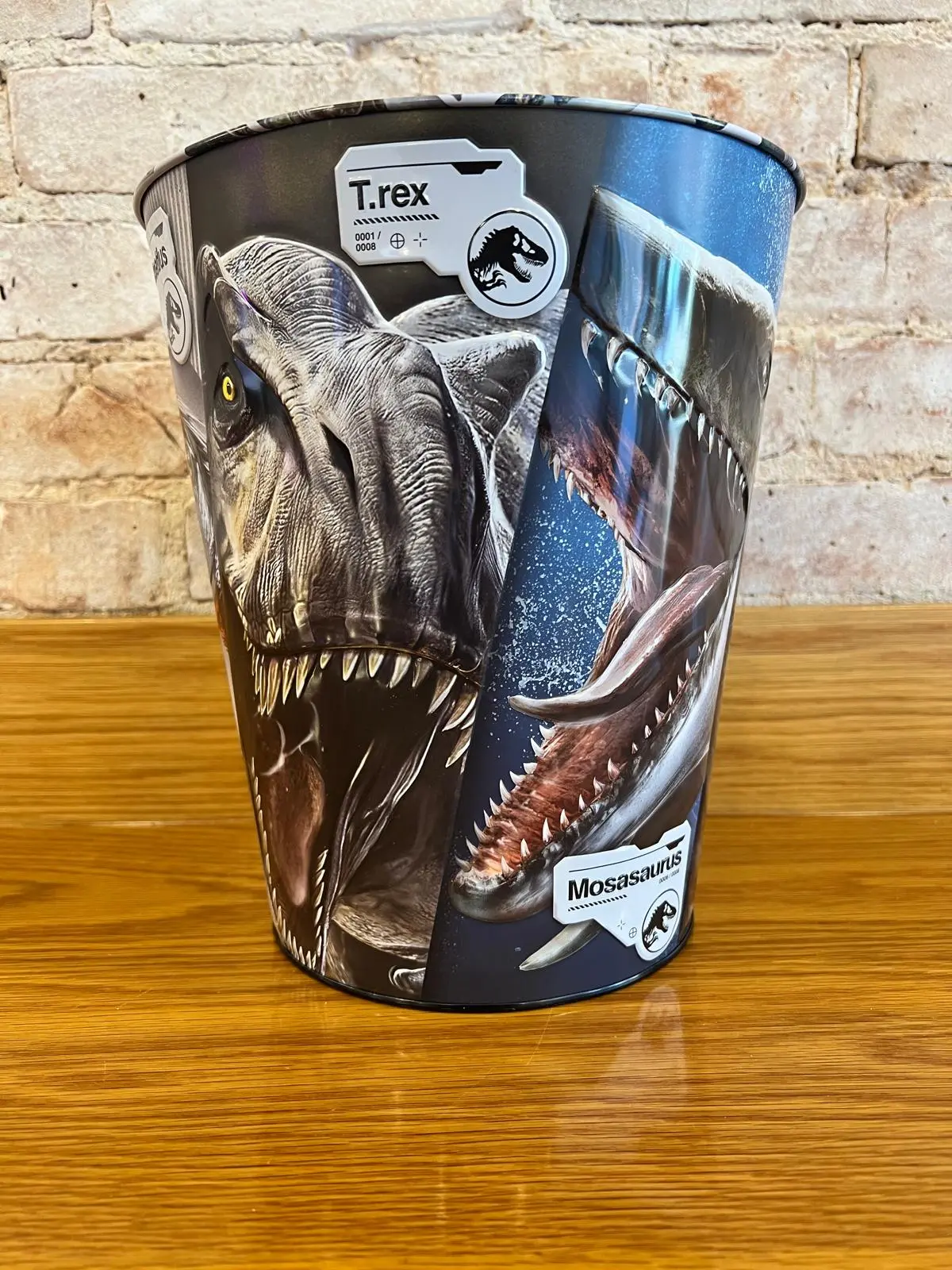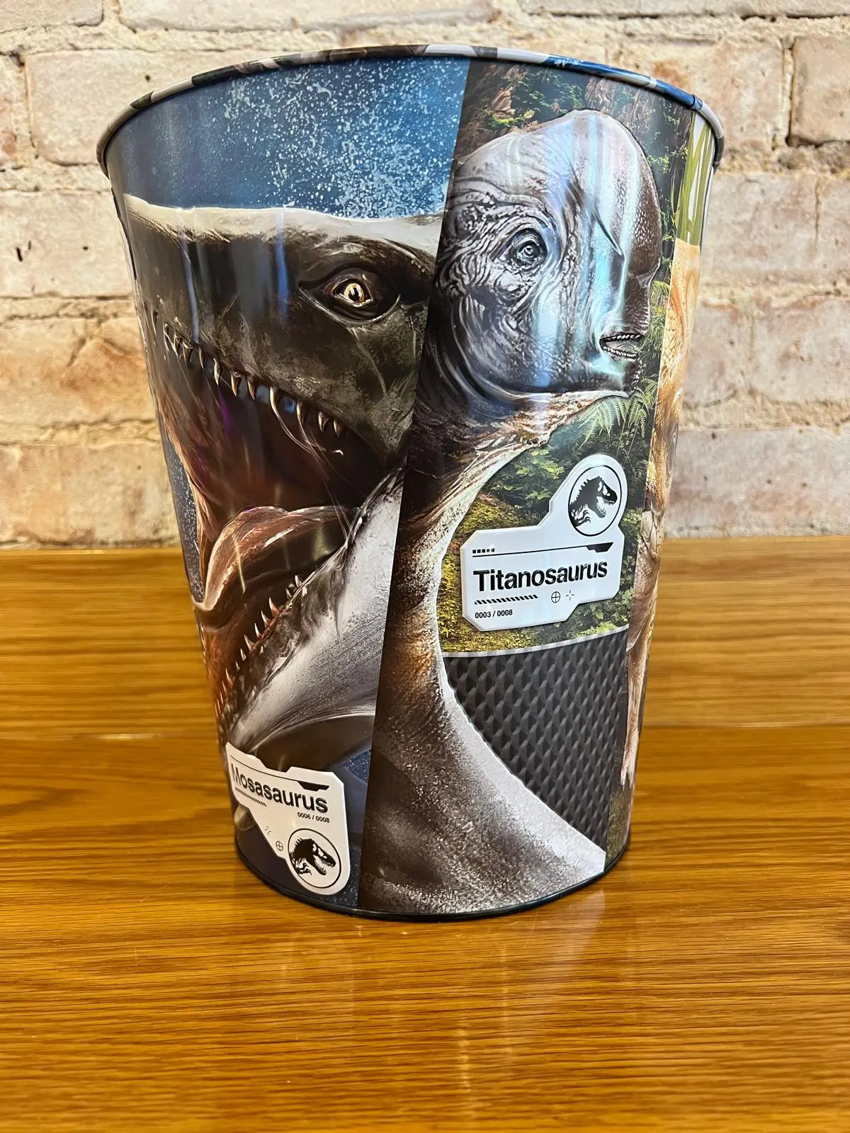 This is a limited time AMC metal tin popcorn bucket from the movie Jurassic world: Rebirth released in 2025. Compared to the other plastic popcorn buckets such as the footprint bucket, It is made of high-gloss metal making it forever collection. The bucket has a highly detailed wraparound graphics showcasing the new dinosaurs shown in the movie. It showcases the Aquilops, Spinosaurus, Quetzalcoatlus, T.rex, Mosasaurus, and the Titanosaurus. The graphics has a raised 3D effect on the outside making the artwork pop also including Dino ID for each Dinosaur. The bucket has capacity of a massive 230oz and very easy to clean making it a great themed multi purpose bucket.