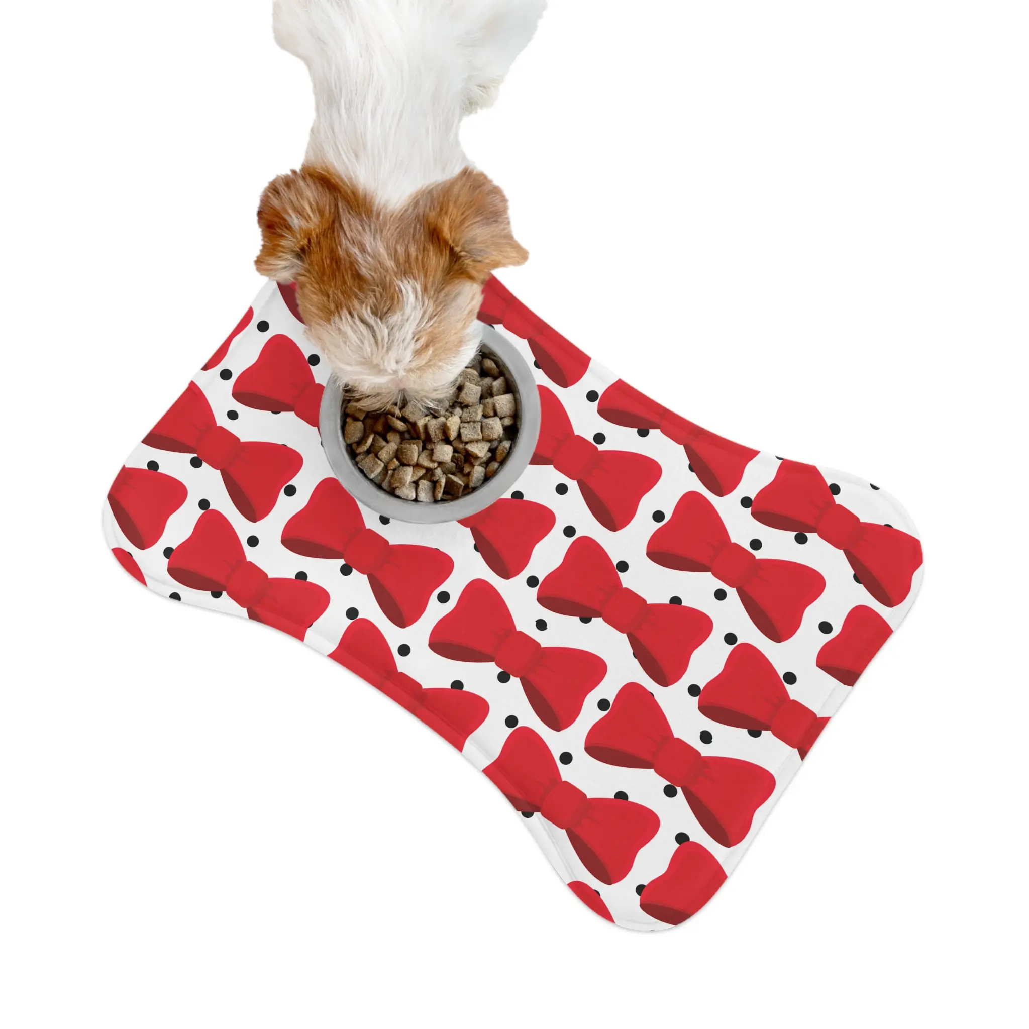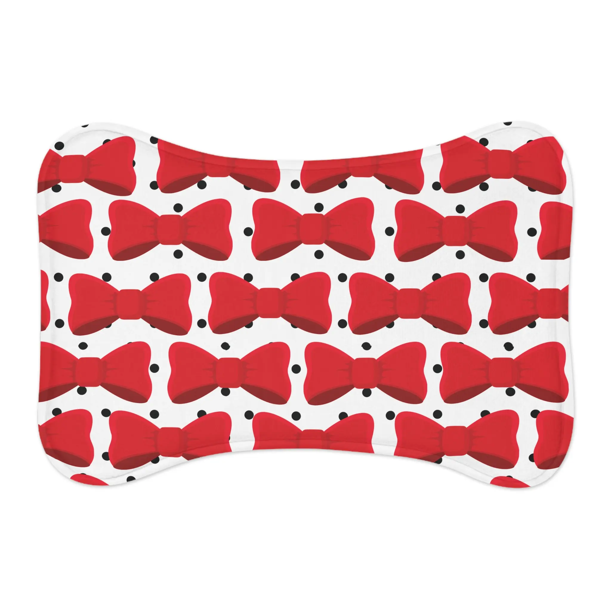 This plush pet feeding mat brings tidy mealtimes and a touch of playful style to any home. The soft, absorbent memory foam core soaks up spills and crumbs, while the non-slip backing keeps the mat steady beneath bowls and busy paws. The one-sided print features a cheerful repeating mini mouse style red bow-tie pattern on a polka dotted white background—bright, fun, and easy to coordinate with kitchen or pet décor. Lightweight and quick-drying, it’s simple to wipe or spot-clean, and its cushioned surface adds comfort for small pets as they eat. Sized to sit neatly under food and water dishes, this mat makes cleanup quicker and keeps floors protected from drips and scatter.
