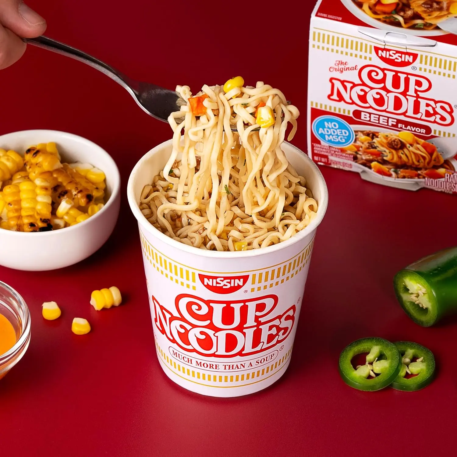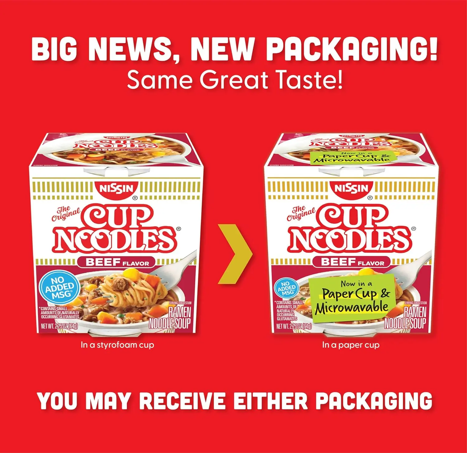 Nissin Cup Noodles Soup, Beef Flavor, Microwaveable Paper Cups, Instant Ramen, 2.25 Ounce (Pack of 12)
