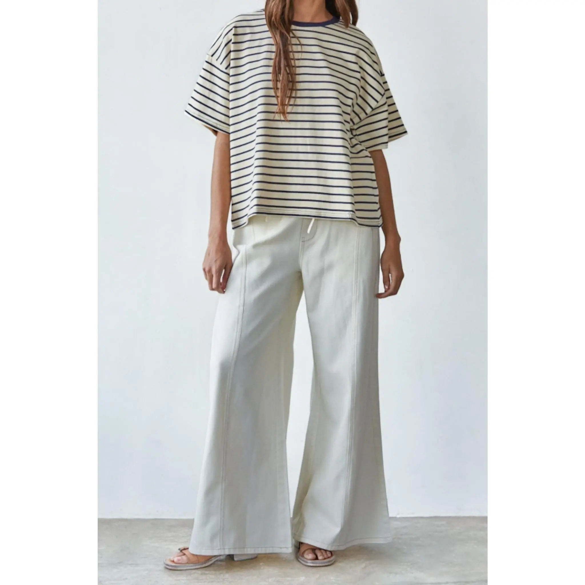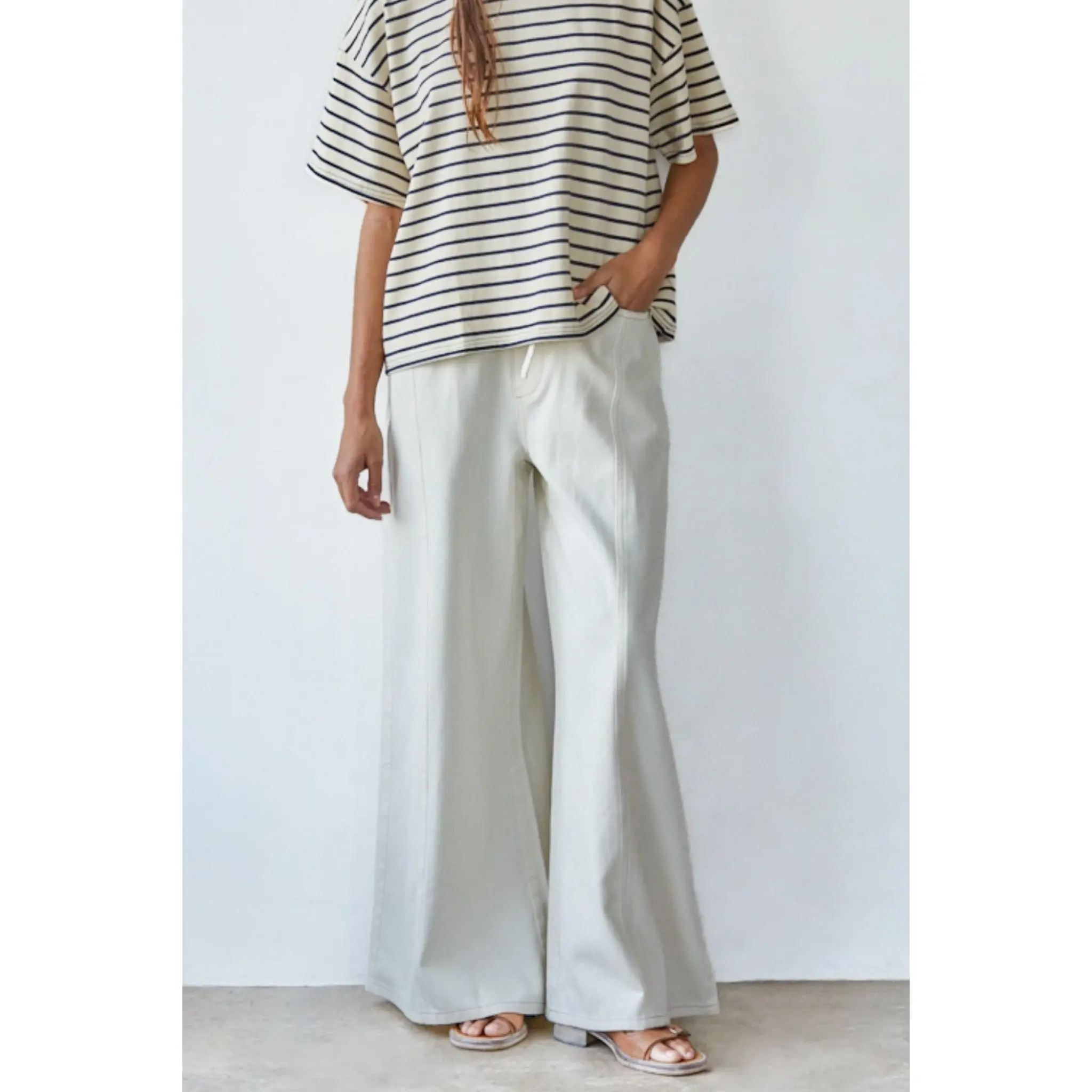 The It's Groovy Wide Leg Jeans in Ecru are lightweight and perfect for all of your summer adventures! Featuring pockets, ecru color, seam details, wide leg silhouette with flare, elastic waistband with drawstring, lightweight fabric and a true to size fit.