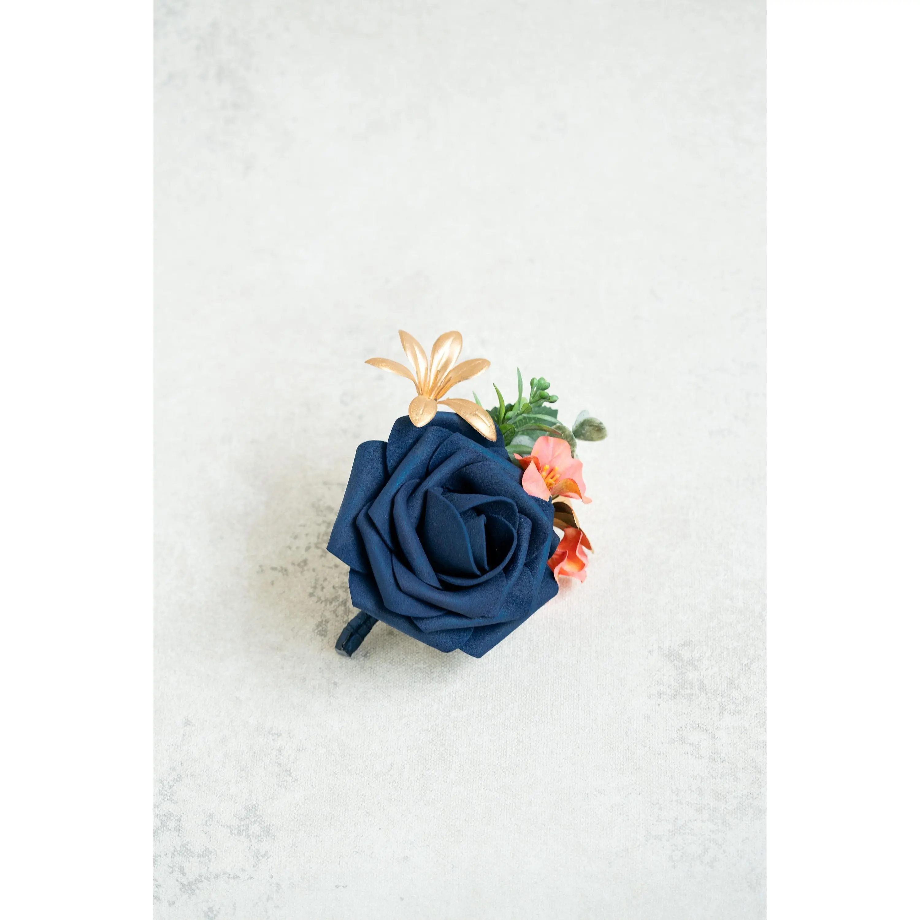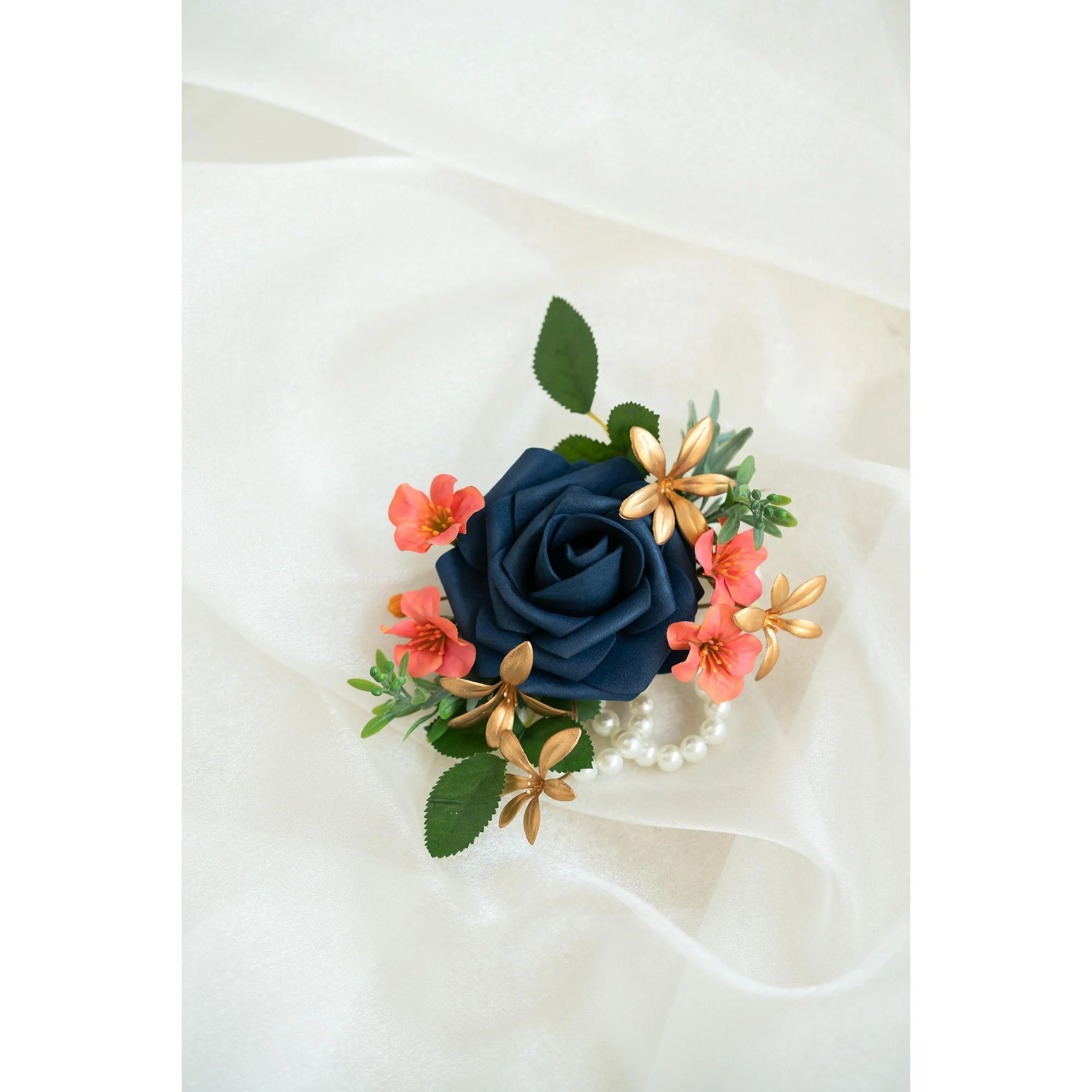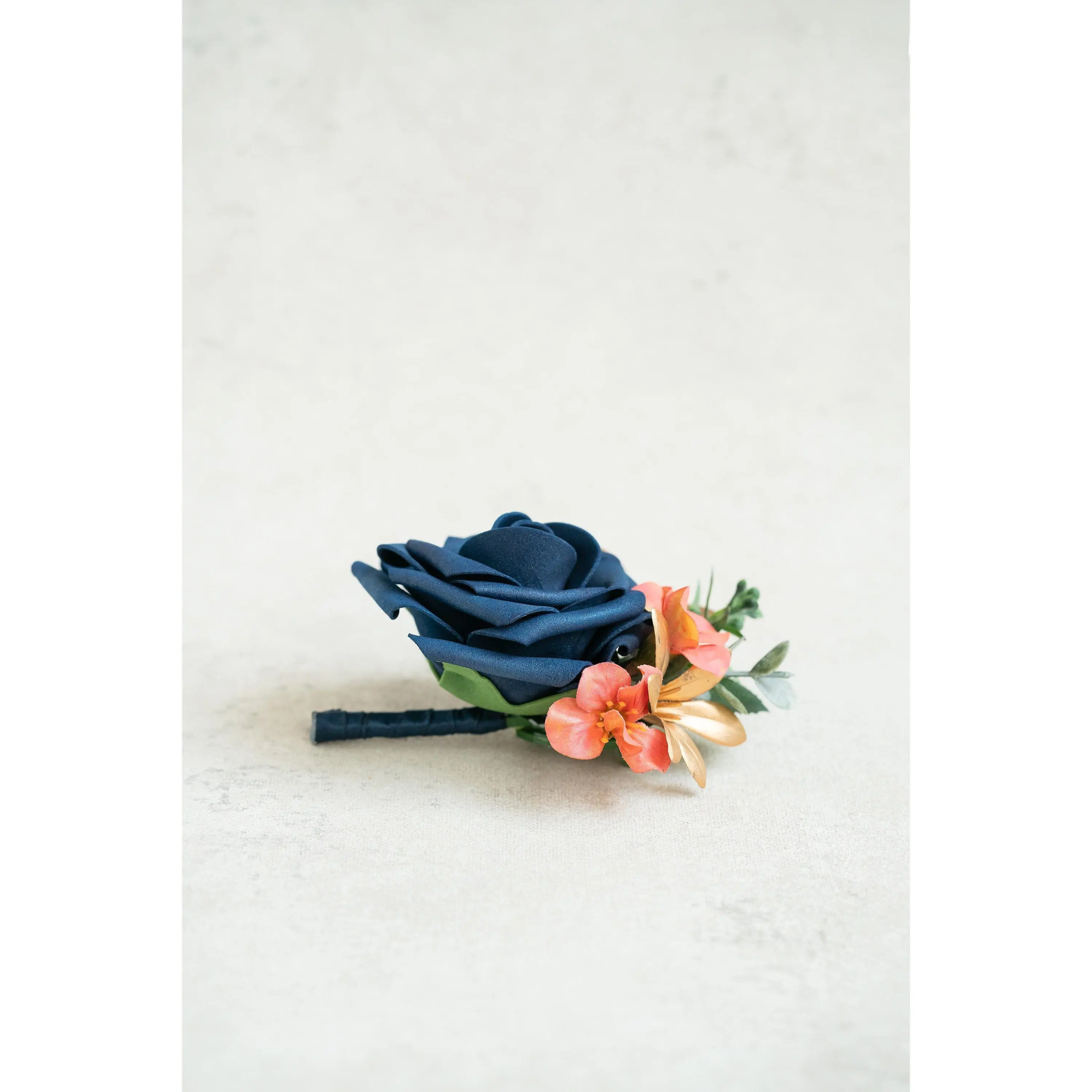 ❤This navy blue corsage is made with foam rose flowers, coral campsis and gold orchid. The price includes one corsage or one boutonniere.The ribbon color can be customized, and we offer complimentary ribbon printing services.❤ Dimension: 4.5 inches in Diameter❤ Lovingly crafted with real touch flowersThis romantic-looking, lifelike bouquet is crafted to closely mimic the look and feel of fresh blooms. It offers exceptional elasticity, flexibility, and vibrant color gradations, making it the premium choice among artificial flowers.❤ ColorNavy blue, coral and gold❤ Versatile foam corsage for Weddings, Events & Home DecorThe foam corsage is an ideal choice for wedding flower decorations and home decor. The realistic, delicate petals add elegance and charm, making it perfect for weddings, special events, or even as a beautiful accent in your home.❤Matching bouquets, boutonnieres...All matching items are available, including boutonnieres, corsages, chair decorations, swags, hair accessories, and home decorations. Please message us for a quote, or Email us at coutureblooms.care@gmail.com. We would love to work with your budget and do custom wedding packages just for you!❤Change flower colorsIf you love this bouquet but want different colors, please send me a message, we'd be happy to provide a quote for you.❤PackagingWe will pack your flowers very carefully to ensure they will be delivered safely and in perfect shape.❤ShippingTo better serve you and save your time, we use our private shipping method as the default for most orders: US Addresses: Estimated delivery in 2-5 days UK & European Addresses: Estimated delivery in 5-15 days Australia & Canada Addresses: Estimated delivery in 10-25 daysFor urgent orders, we offer FedEx and DHL global express shipping.***Our home base is in Orange County, California, and we source from global manufacturing partners to ensure the highest quality of our products.Feel free to reach out with any additional questions. Your satisfaction is our top priority.***All items and photos are copyrighted and belong exclusively to Couture Blooms.