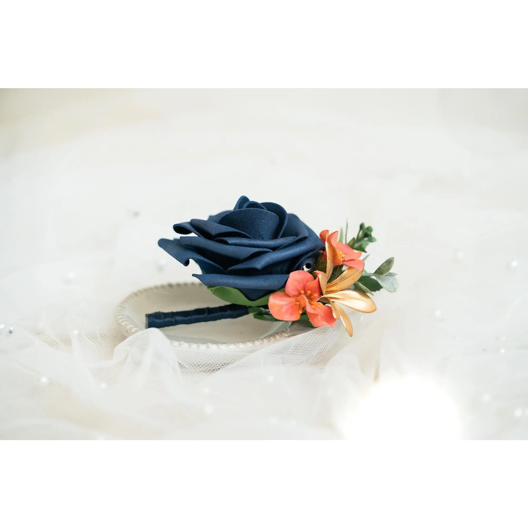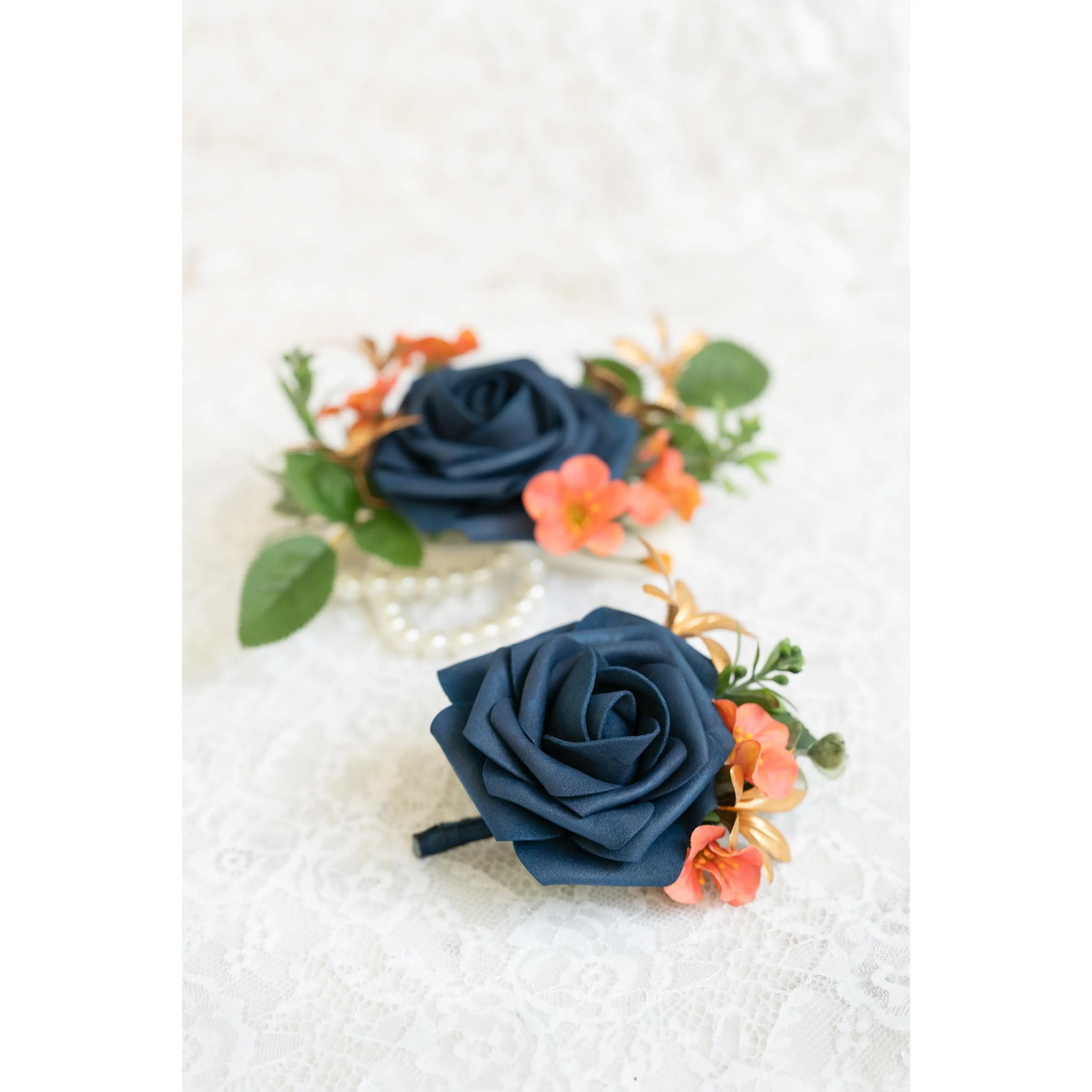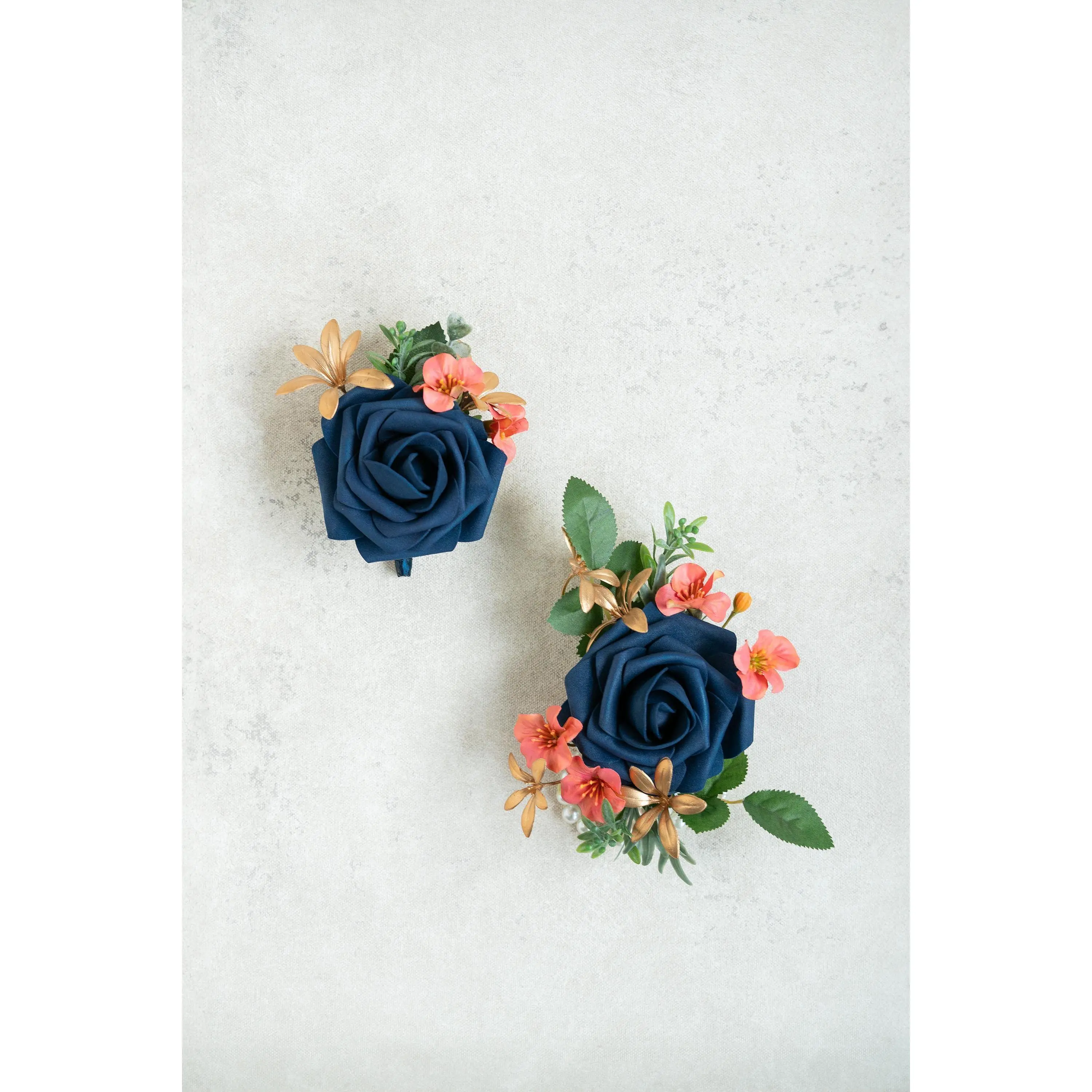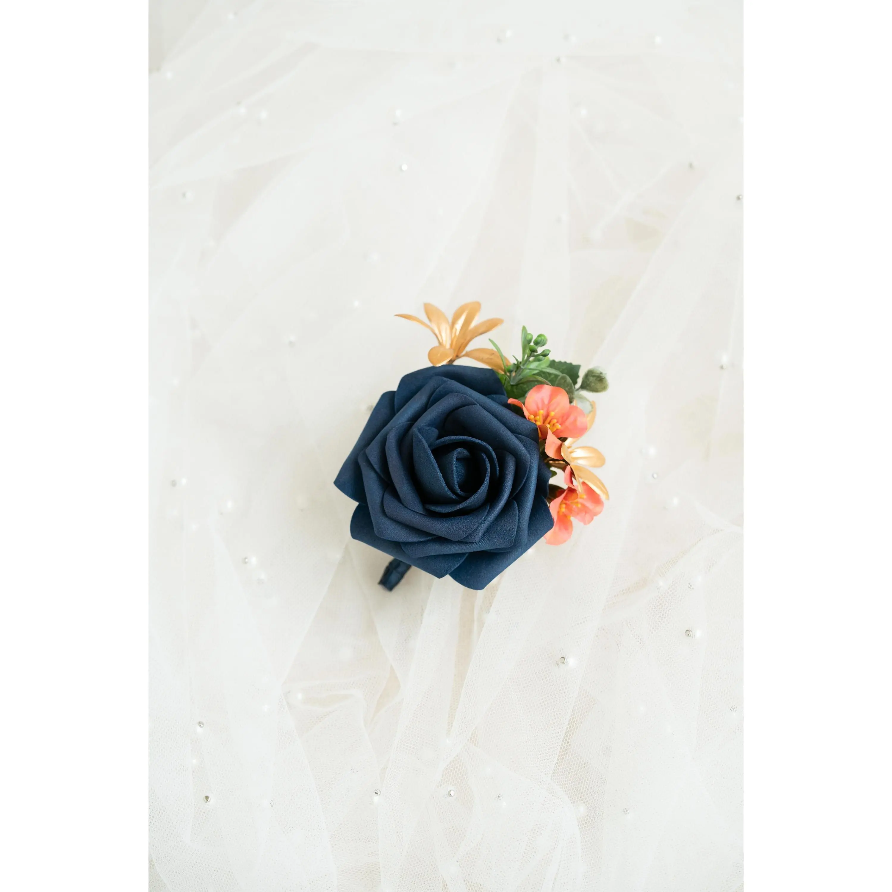 ❤This navy blue corsage is made with foam rose flowers, coral campsis and gold orchid. The price includes one corsage or one boutonniere.The ribbon color can be customized, and we offer complimentary ribbon printing services.❤ Dimension: 4.5 inches in Diameter❤ Lovingly crafted with real touch flowersThis romantic-looking, lifelike bouquet is crafted to closely mimic the look and feel of fresh blooms. It offers exceptional elasticity, flexibility, and vibrant color gradations, making it the premium choice among artificial flowers.❤ ColorNavy blue, coral and gold❤ Versatile foam corsage for Weddings, Events & Home DecorThe foam corsage is an ideal choice for wedding flower decorations and home decor. The realistic, delicate petals add elegance and charm, making it perfect for weddings, special events, or even as a beautiful accent in your home.❤Matching bouquets, boutonnieres...All matching items are available, including boutonnieres, corsages, chair decorations, swags, hair accessories, and home decorations. Please message us for a quote, or Email us at coutureblooms.care@gmail.com. We would love to work with your budget and do custom wedding packages just for you!❤Change flower colorsIf you love this bouquet but want different colors, please send me a message, we'd be happy to provide a quote for you.❤PackagingWe will pack your flowers very carefully to ensure they will be delivered safely and in perfect shape.❤ShippingTo better serve you and save your time, we use our private shipping method as the default for most orders: US Addresses: Estimated delivery in 2-5 days UK & European Addresses: Estimated delivery in 5-15 days Australia & Canada Addresses: Estimated delivery in 10-25 daysFor urgent orders, we offer FedEx and DHL global express shipping.***Our home base is in Orange County, California, and we source from global manufacturing partners to ensure the highest quality of our products.Feel free to reach out with any additional questions. Your satisfaction is our top priority.***All items and photos are copyrighted and belong exclusively to Couture Blooms.