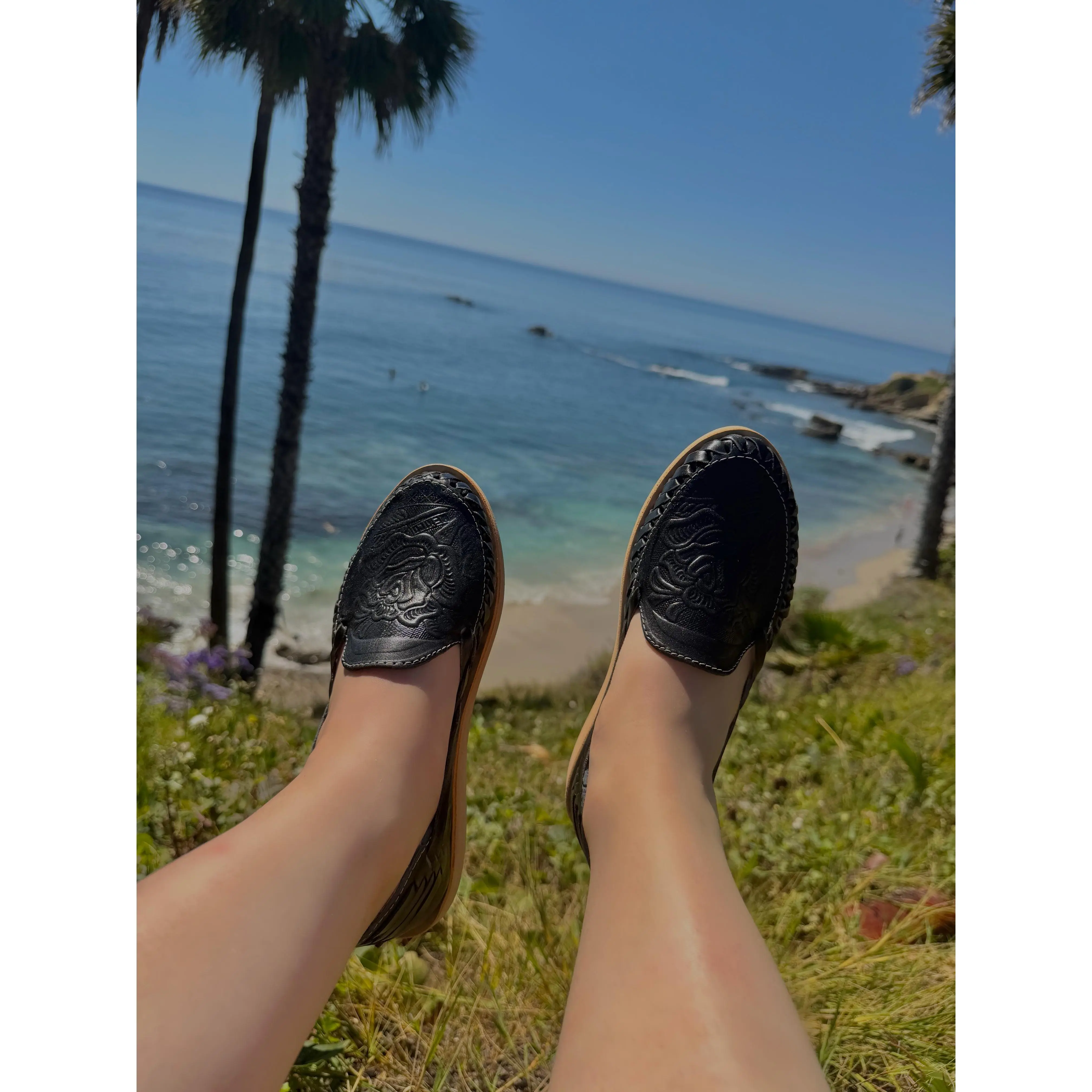 Classic, versatile, and deeply authentic. Our Divina Herencia Co "Patria" flats are handcrafted from premium black leather and feature a stunning hand-pressed rose design. Proudly displaying the "Mexico" name within the artisanal embossing, these closed-toe huaraches are a beautiful tribute to traditional craftsmanship and national pride.