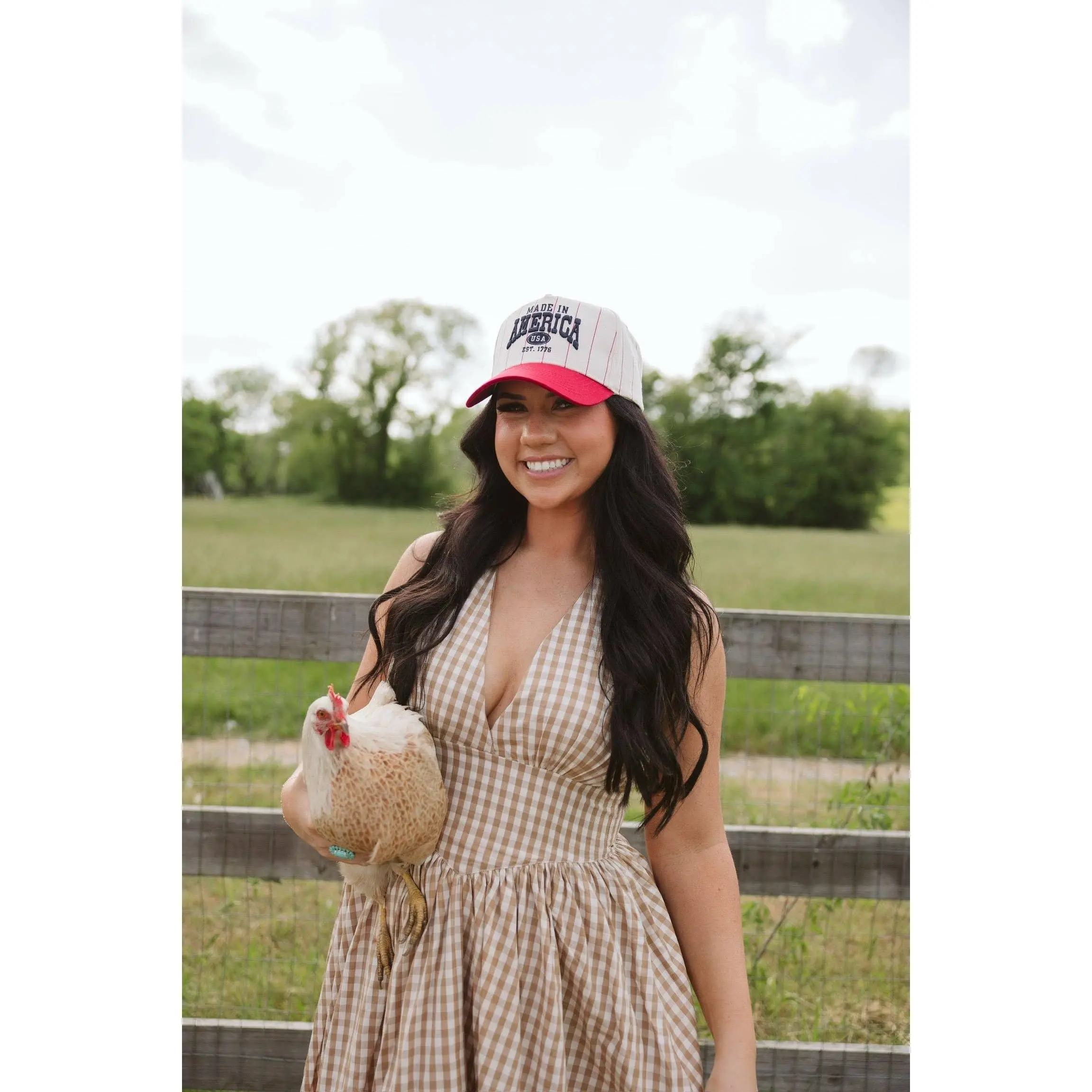 Featuring a cream pinstripe front with bold navy embroidery and a pop of red on the bill, this hat brings that timeless, all-American look to life. It’s perfect for summer days, backyard hangs, market mornings, and everything in between.