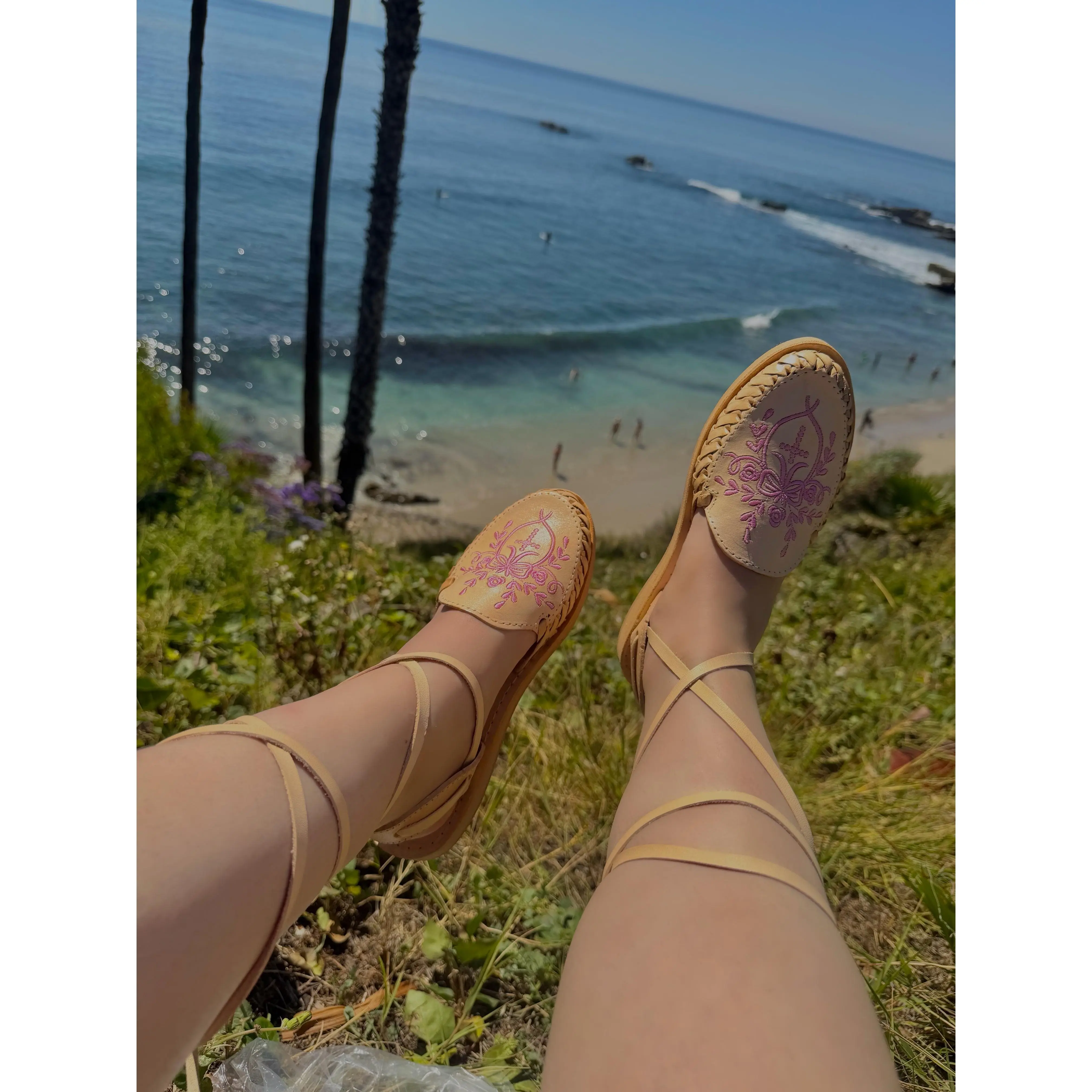Elevate your collection with our Divina Herencia Co "Fe" lace-up sandals. Crafted from premium natural-toned leather, these huaraches feature a delicate and detailed pink cross embroidery at the center, surrounded by ornate floral accents. Handcrafted by master artisans in Mexico, these sandals offer a beautiful expression of tradition and grace.
