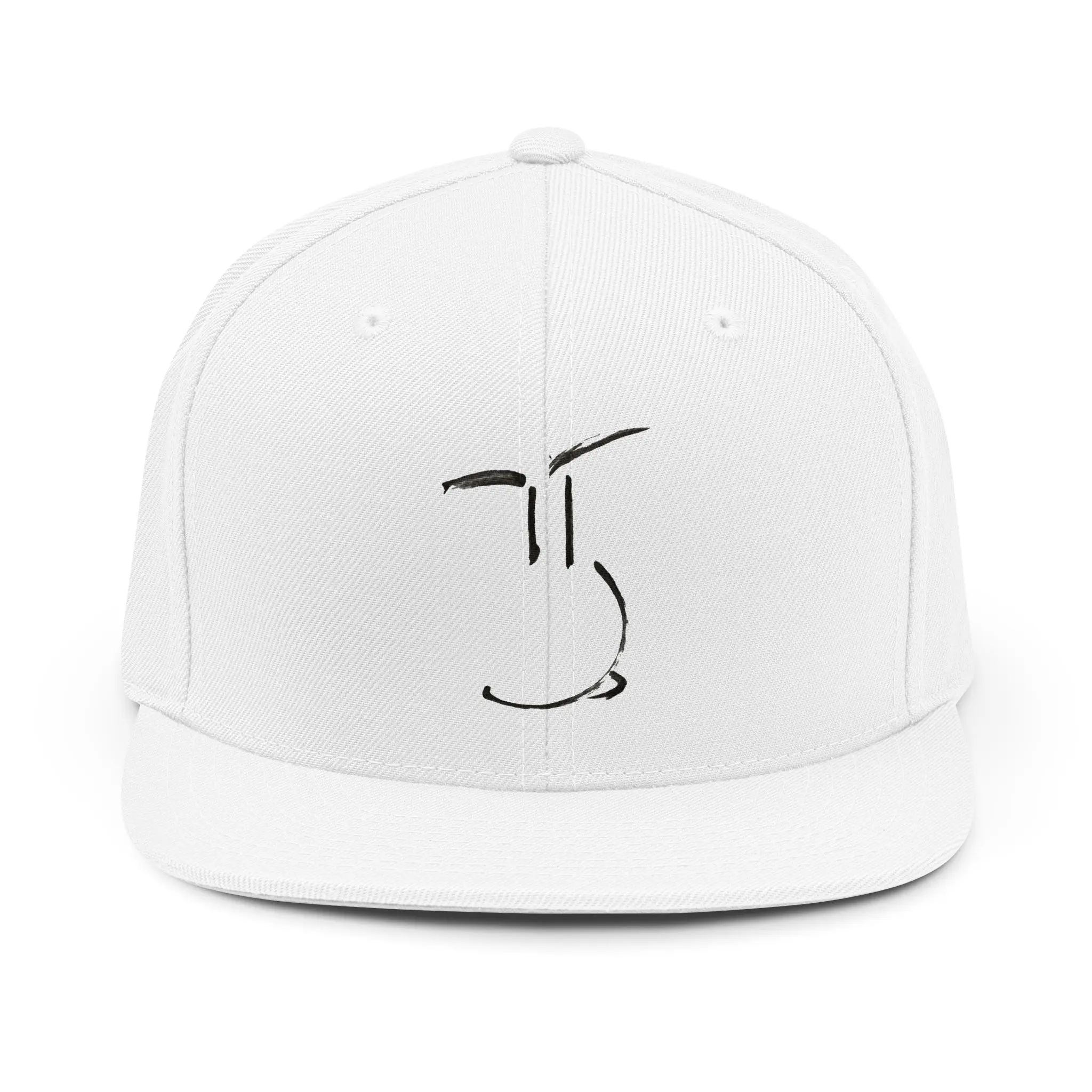 This structured snapback carries a quiet, artful energy. The minimal, hand-drawn face embroidered at the front reads like a small, knowing sketch—subtle and expressive. Built with a high-profile six-panel crown and a classic curved visor with a green undervisor, the hat sits tall and intentional. The textured acrylic/wool blend (or full acrylic in white) gives it a slightly vintage, durable feel that softens with wear. An adjustable plastic snap keeps the fit flexible while sewn eyelets add breathability. Wear it on morning walks, gallery visits, or while sketching at a café—this cap blends studio sensibility with everyday utility, letting the wearer show quiet creativity without shouting.