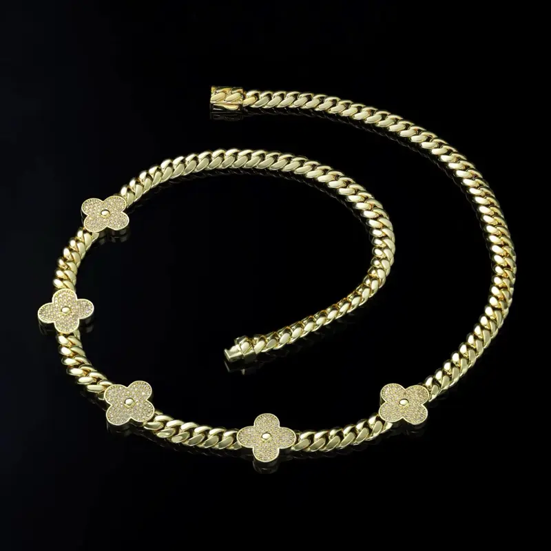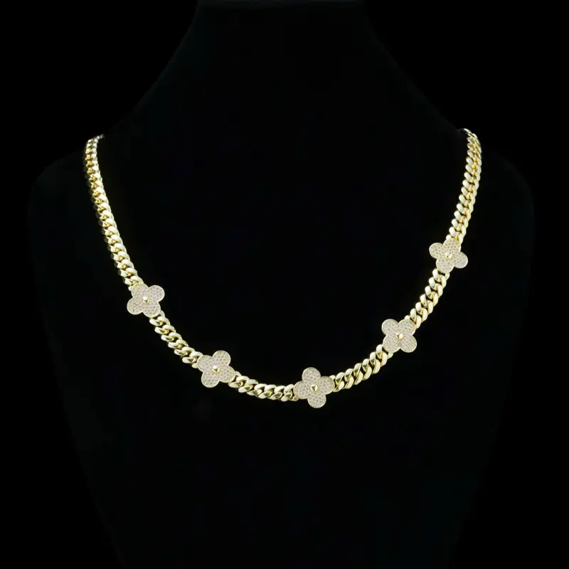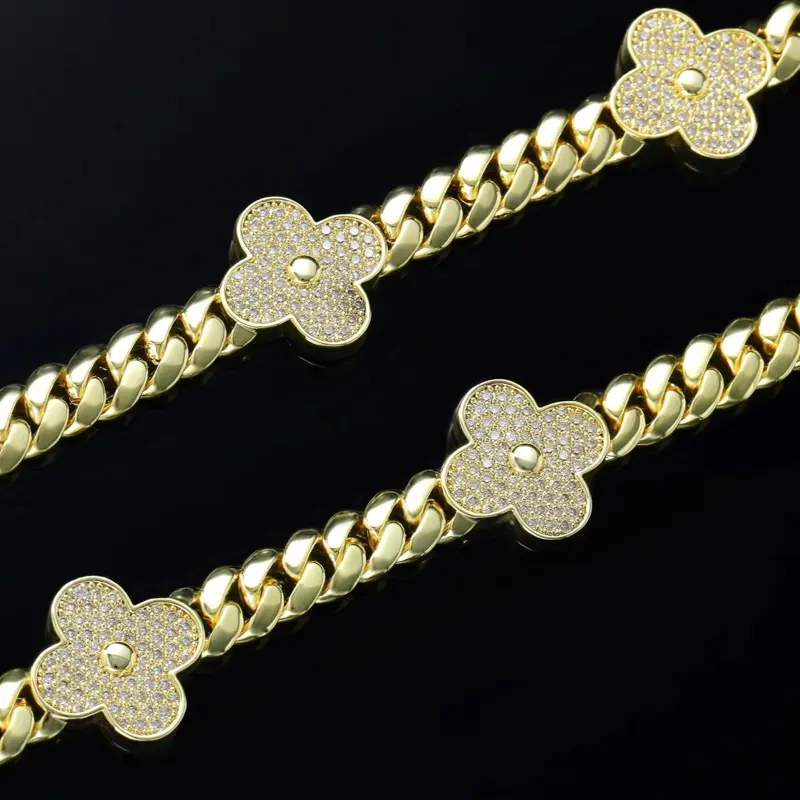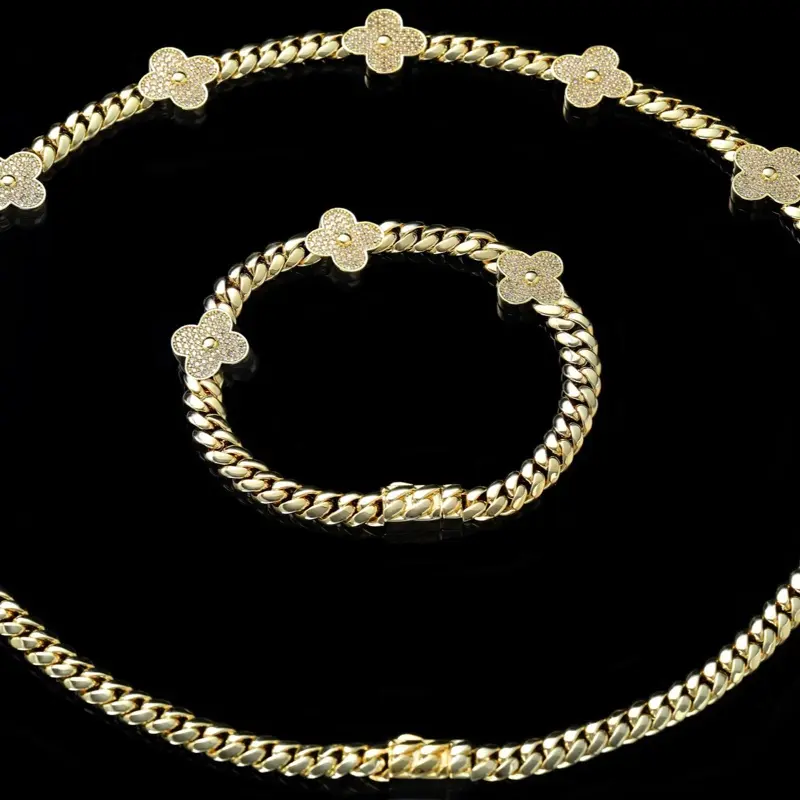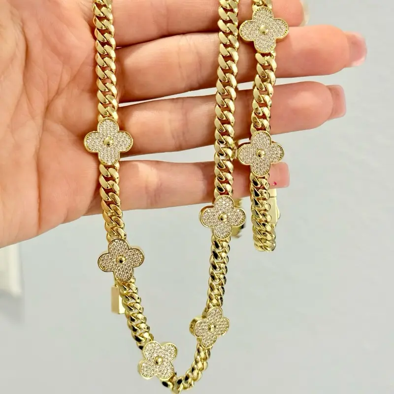 14K Gold Plated CZ Clover Flower Cuban Choker Chain Necklace & Bracelet Set Fashion Jewelry Gift Cubic Zirconia Stones