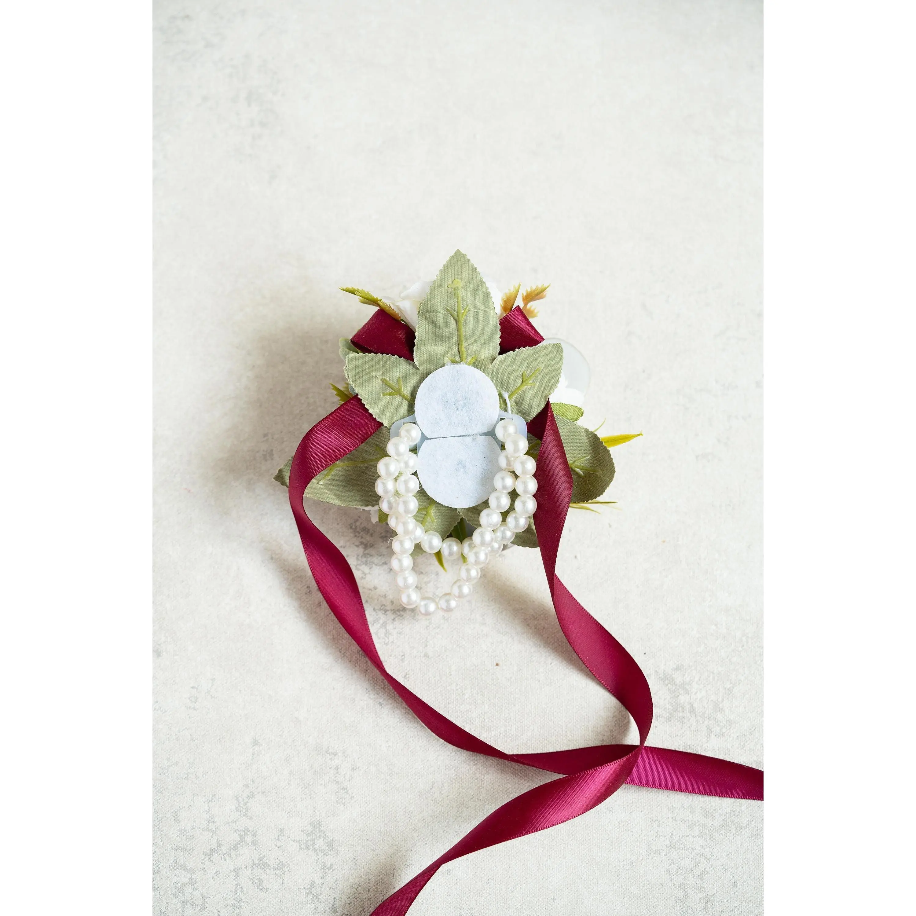 Burgundy Rose Pearl Bracelet Corsage – Real Touch Wrist Corsage with Ivory Accents, Wedding Boutonniere for Mom, Bridesmaid & Prom Gift