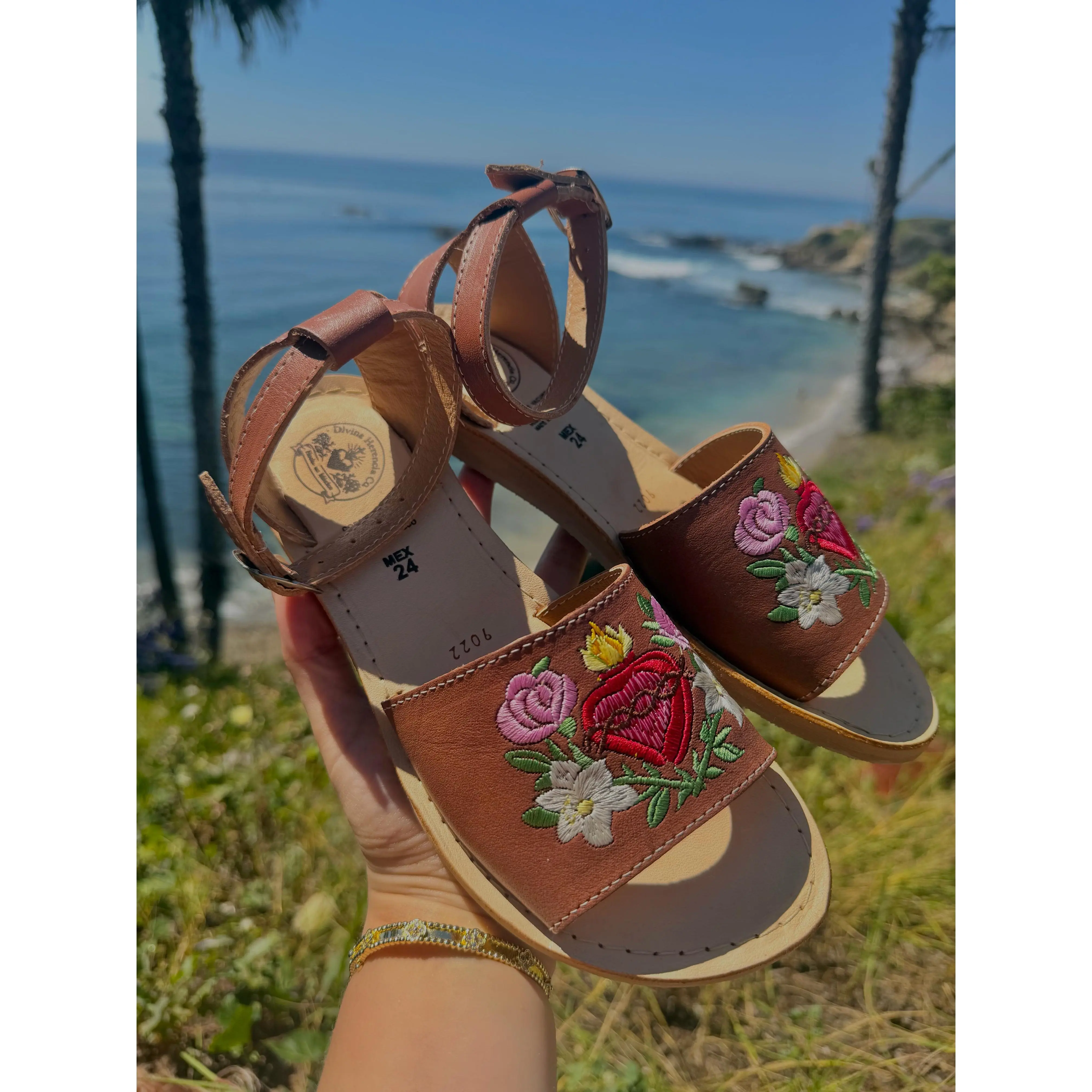 Embrace tradition with our Divina Herencia Co "Sagrado Corazón" sandals. These stunning flats feature a beautifully detailed Sacred Heart—a timeless symbol of devotion and love—surrounded by vibrant roses and intricate floral embroidery. Handcrafted by master artisans in Mexico, these cognac-toned leather sandals blend deep cultural roots with high-end artisanal quality.