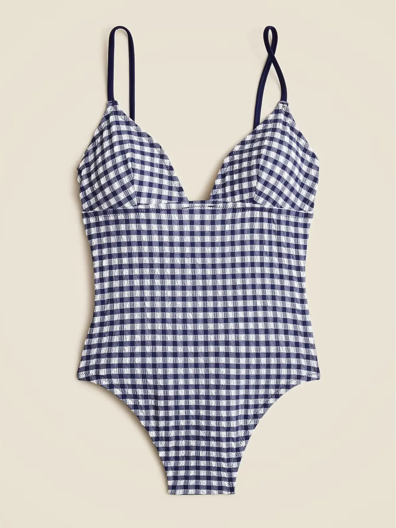 J.CREW one-piece swimsuit in gingham. SIZE: 10. COLOR: navy blue. ITEM # ci363. Medium bust support. High-cut leg. Moderate coverage. Low-rise back.