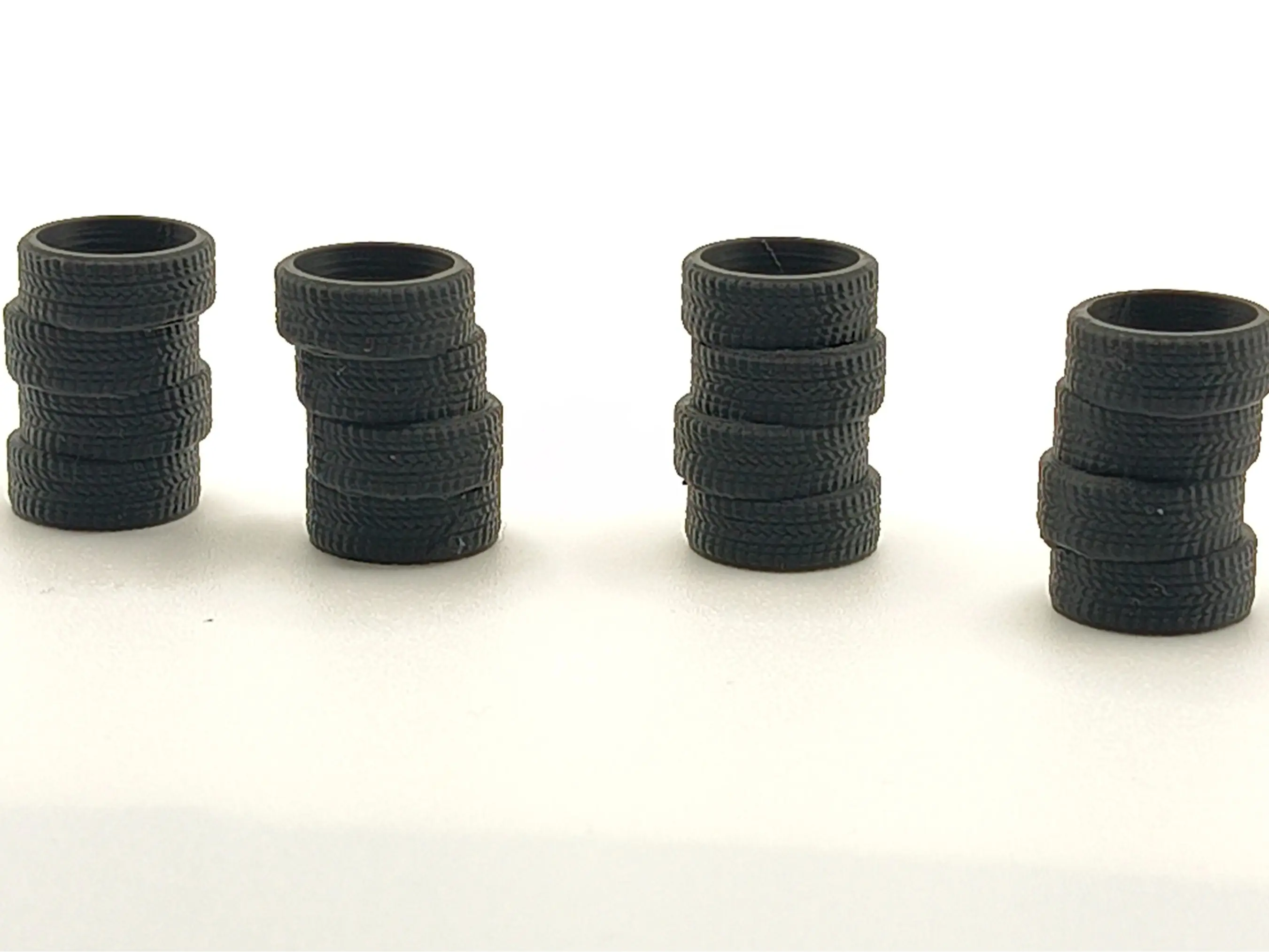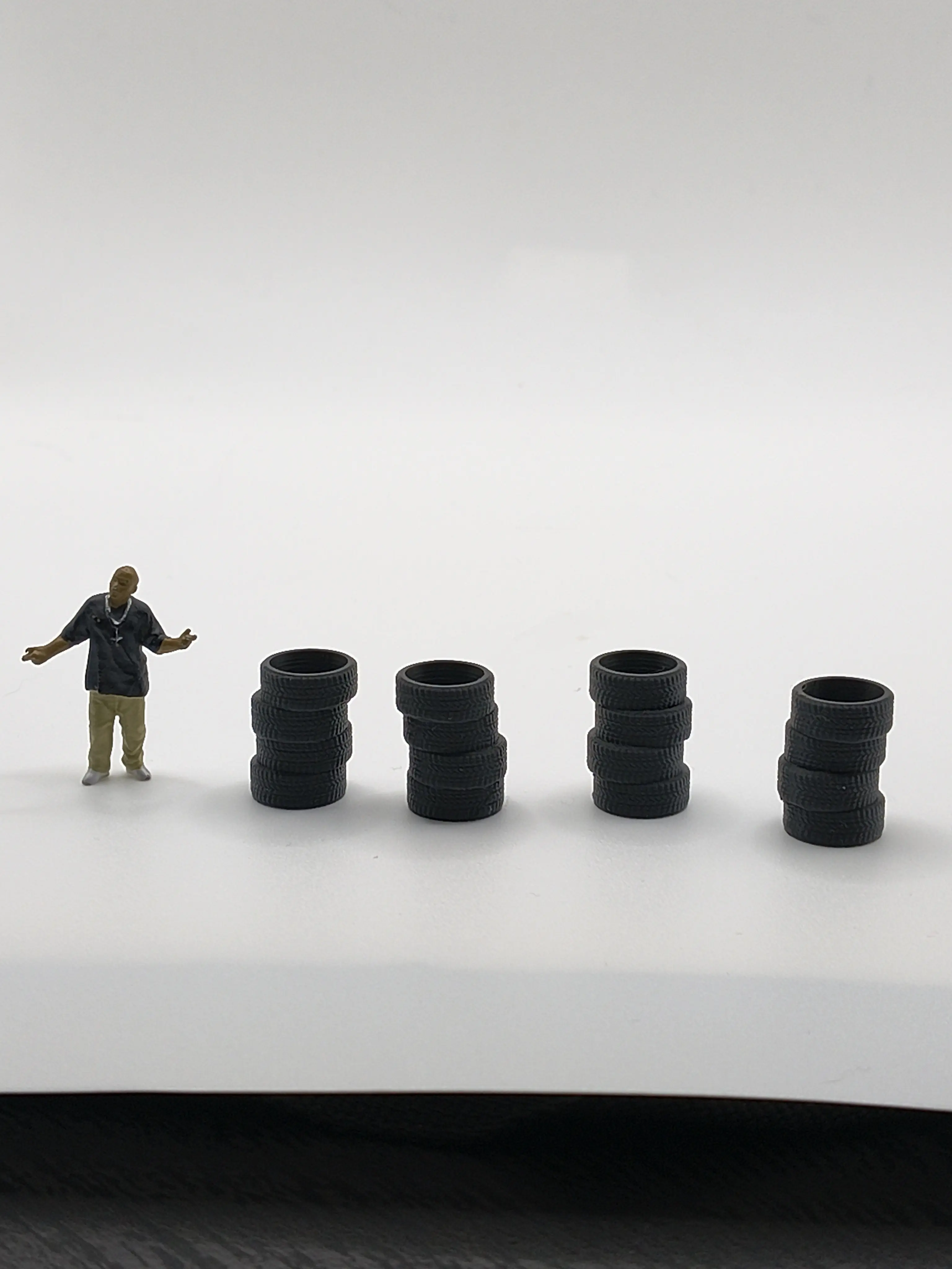 These tire stacks are designed and 3D printed as a single piece using PLA plastic. The tires are not individual rubber tires stacked together, but a miniature prop designed to replicate the appearance of stacked tires for 1:64 scale dioramas and displays.