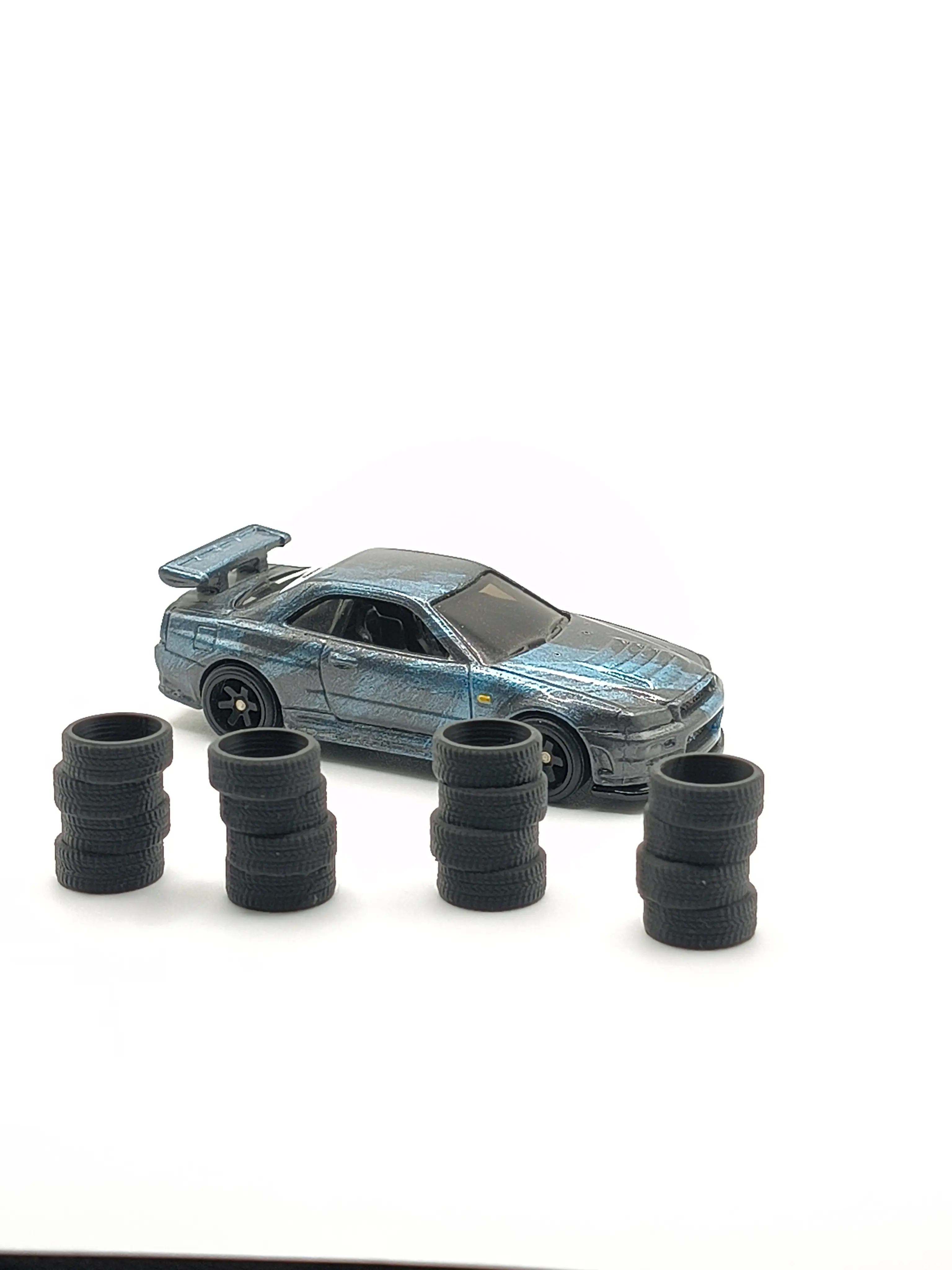 These miniature stacked tires are perfect for creating garage scenes, repair shops, junkyards, and car meet dioramas for Hot Wheels, Matchbox, and other 1:64 scale vehicles.