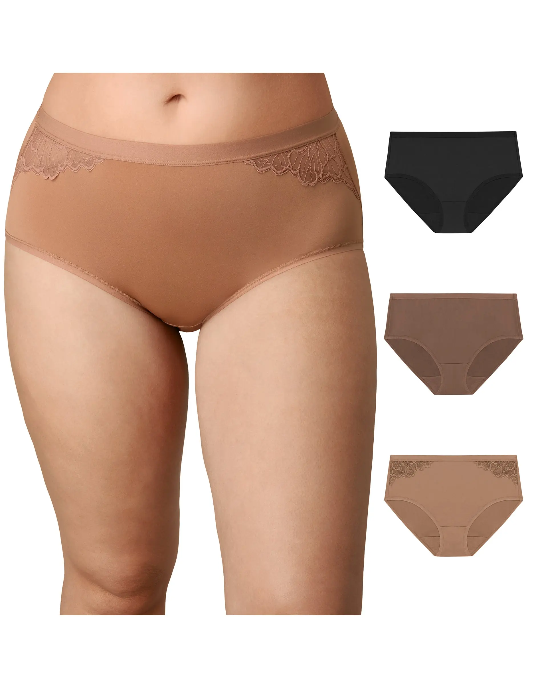 VALUE 3-PACK - Available in a convenient 3-pack with two tailored panties and one featuring romantic lace at the hips.