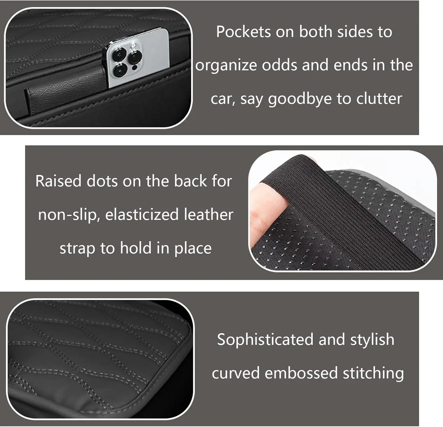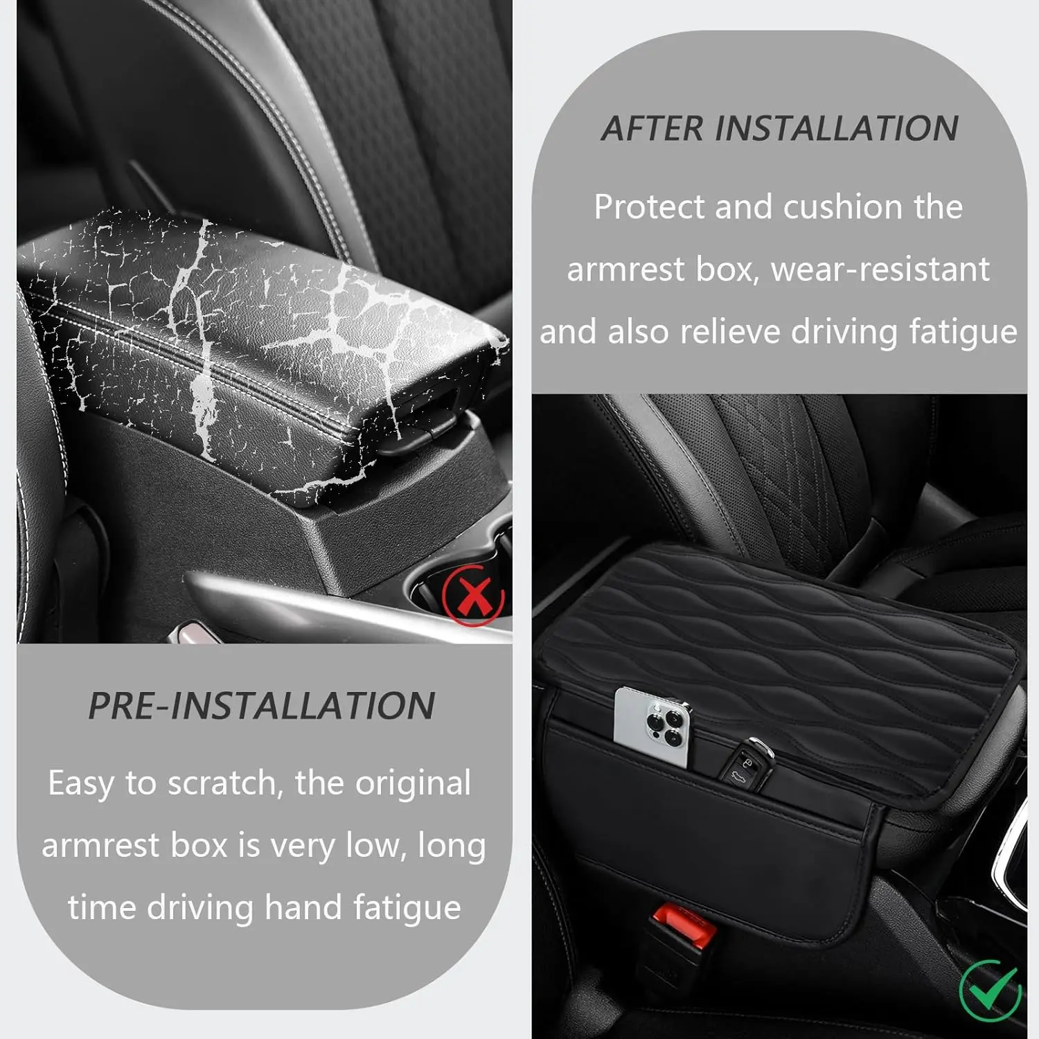 ·The leather center console covers for car with 2 elasticated elastic bands, simply open the armrest box and slide the bands into the box. Always check the size of the armrest box before purchasing!