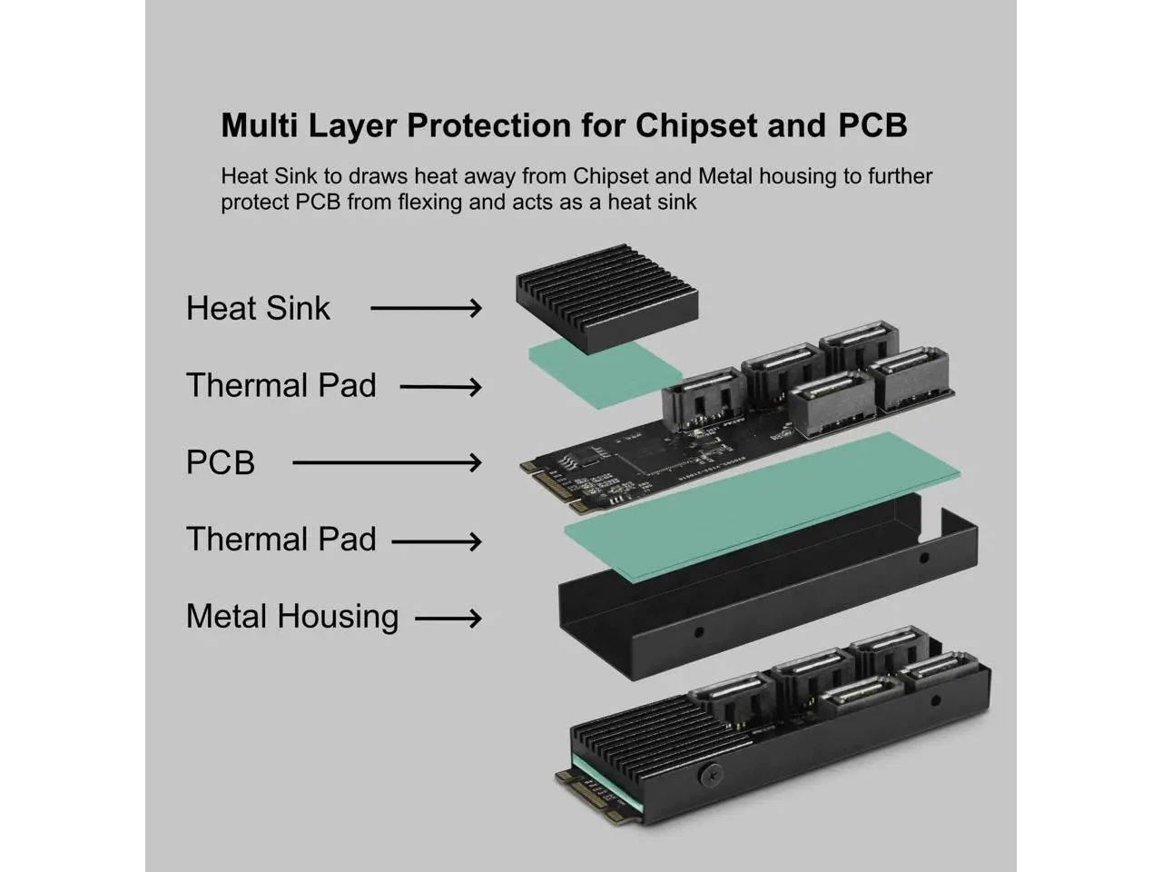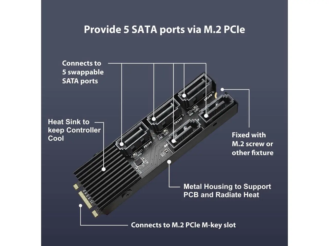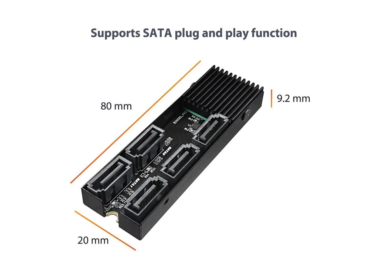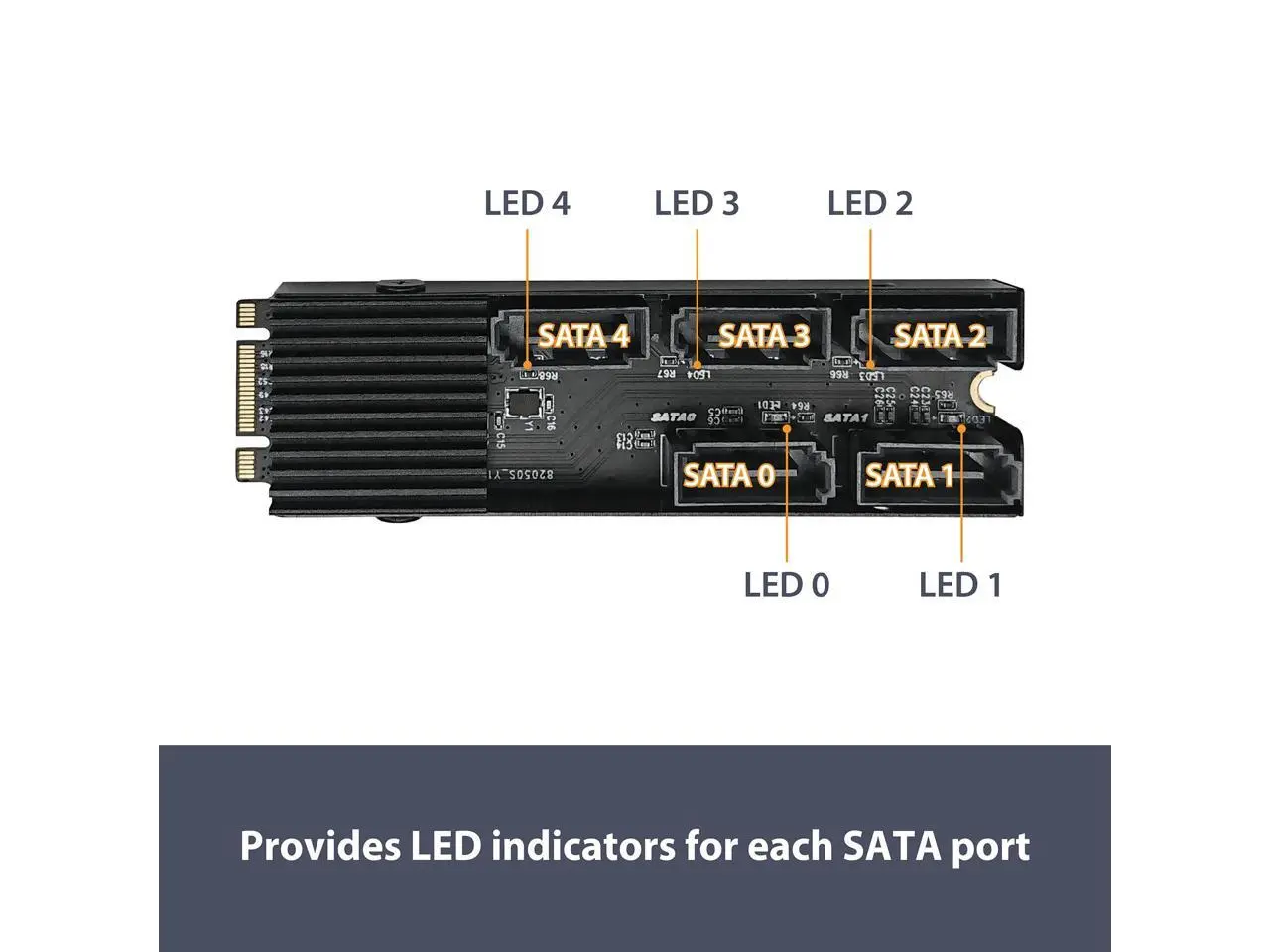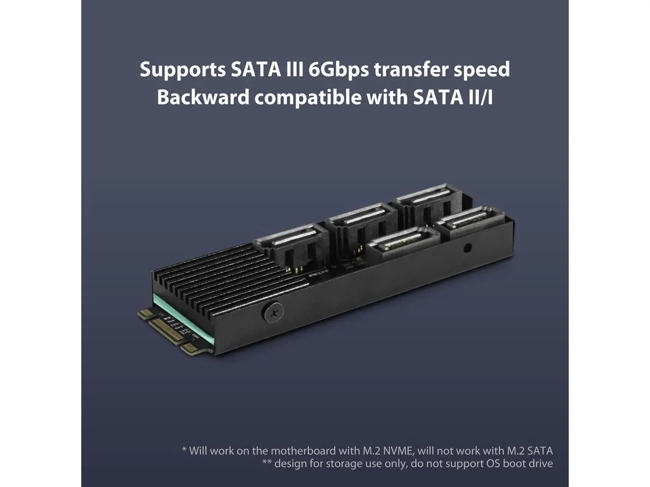 This M.2 PCIe Gen3x2 B+M Key to 5 ports SATA III Expansion Card is designed to use the M.2 NVMe slot on the motherboard to connect 5 SATA devices. It uses PCIe v3.0 with 2 lanes (B+M Key) to link to the 5 SATA devices. This will allow for even greater number of SATA III devices to be connected. It is Plug and Play, no additional software or drivers are required when using Windows 10/11. It is design to support SATA SSD or HDD for fast data transfer and clear LEDs indicators for each SATA port for disk activity. The Core chipset JMB585 manage the 5 SATA port with port multiplier and multiple commands for simultaneous sending/receiving data both in AHCI and legacy IDE mode. It also support TRIM to SSD and is able perform at a theoretical speed of 6Gbps.