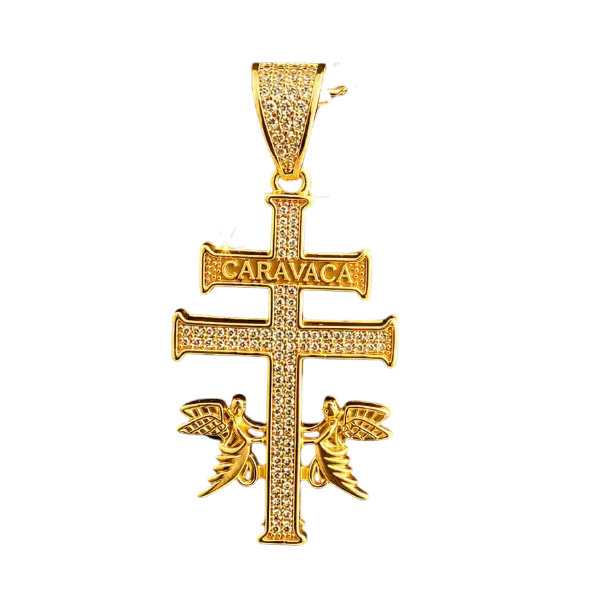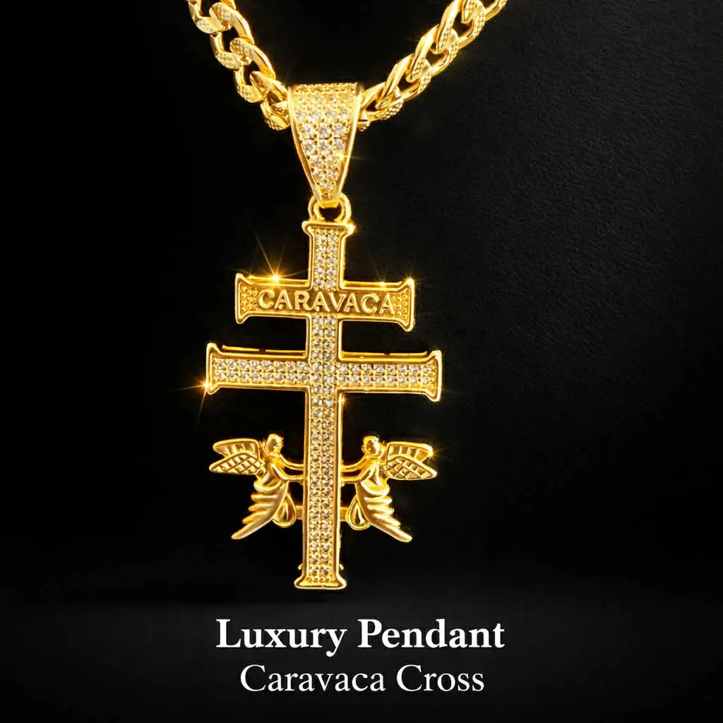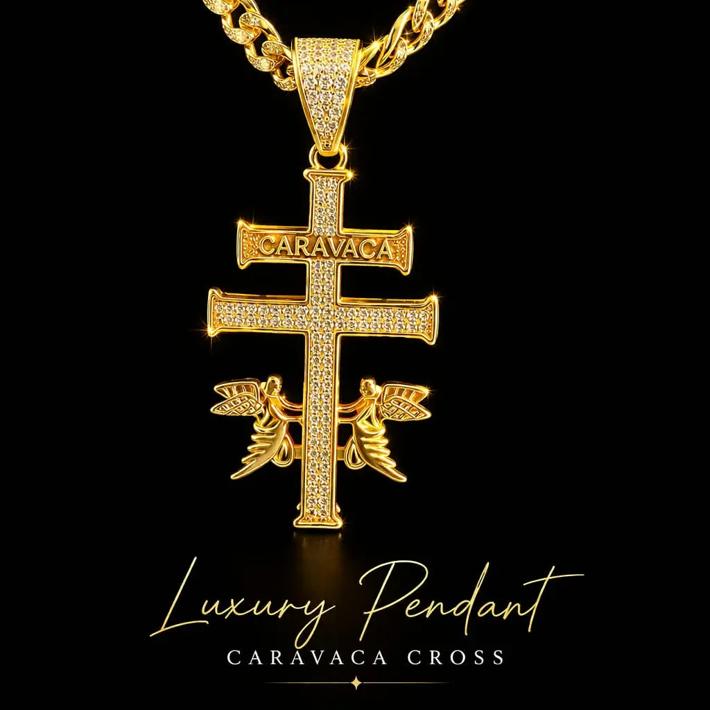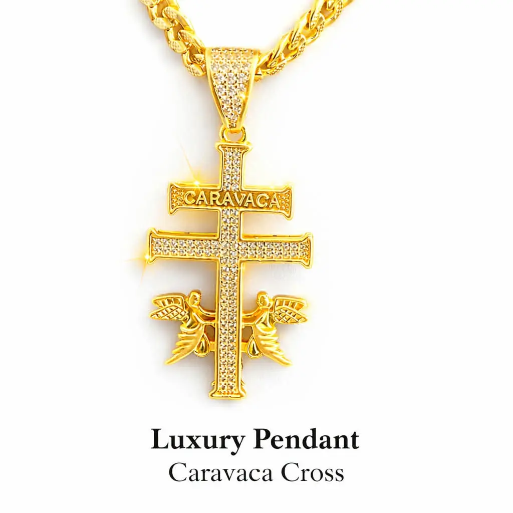 This 14K Gold Finish Iced Out Hip Hop Cruz de Caravaca Pendant Charm Necklace is a unique and stylish piece of jewelry with a vintage charm.