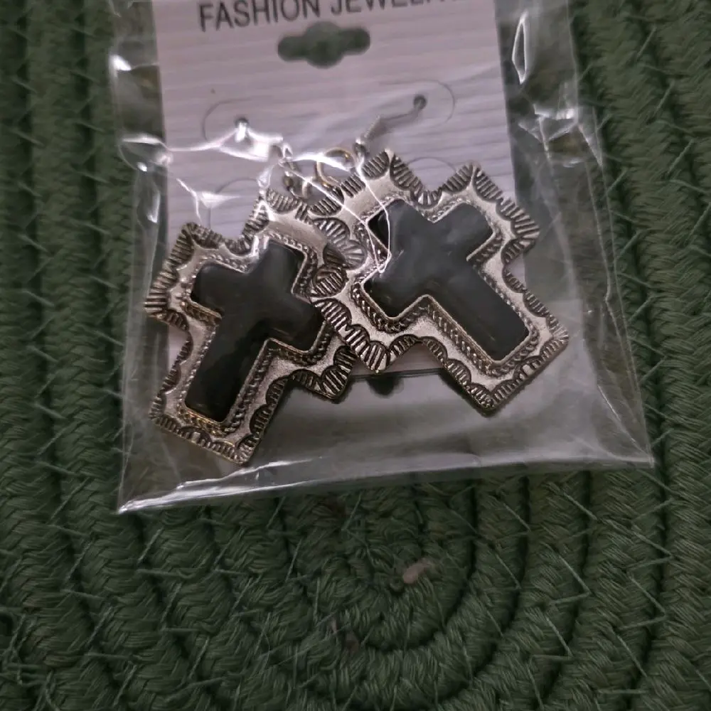 ✨ These earrings feature a striking black and silver cross design. Perfect for those who appreciate bold, symbolic jewelry. The cross shape adds a touch of elegance and meaning to any outfit. Ideal for both casual and formal occasions.