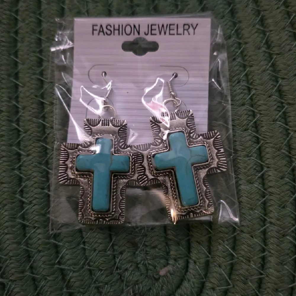 ·These earrings feature a striking blue turquoise cross design. Perfect for adding a touch of elegance to any outfit. The cross shape is a timeless symbol, making these earrings versatile for various occasions.
